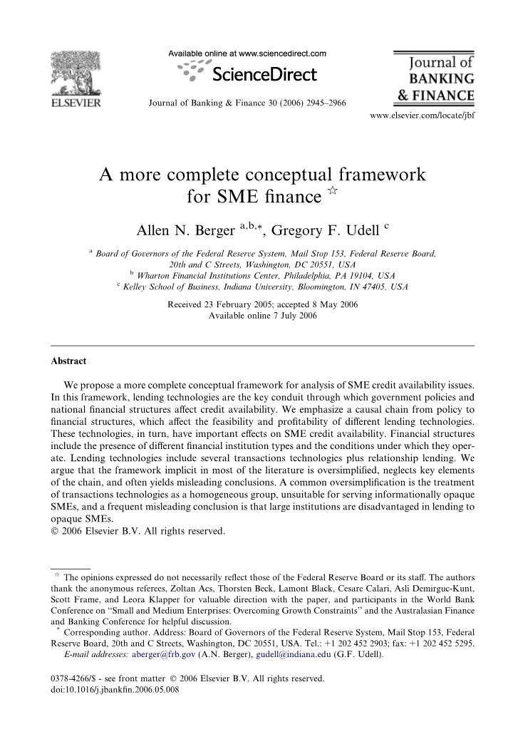 中小企业的外部融资可得性是一个学界特别关注的话题,对于各国政策制定者来说也是一个重要的问题。构建一个概念框架有助于当前对于发达及发展中国家中的金融机构和为中小企业提供贷款的金融市场的研究和建议。这个框架也提出在这些国家中推行通过企业信誉评级来发放贷款政策的影响。然而,我们认为当前的框架体系过简,忽视了融资体系中影响中小企业信贷可得性的关键要素。