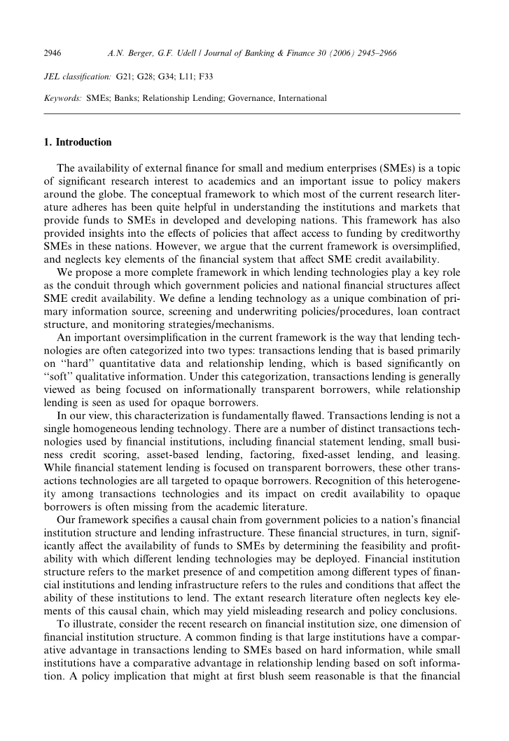 因此我们提出一个更完整的框架,其中借贷技术在政府政策和全国金融体系对中小企业贷款可得化中扮演关键角色。 我们将贷款技术定义为一个能获取初始信息来源,审查及担保政策体系,贷款合同体系以及监管措施的独特技术组合。