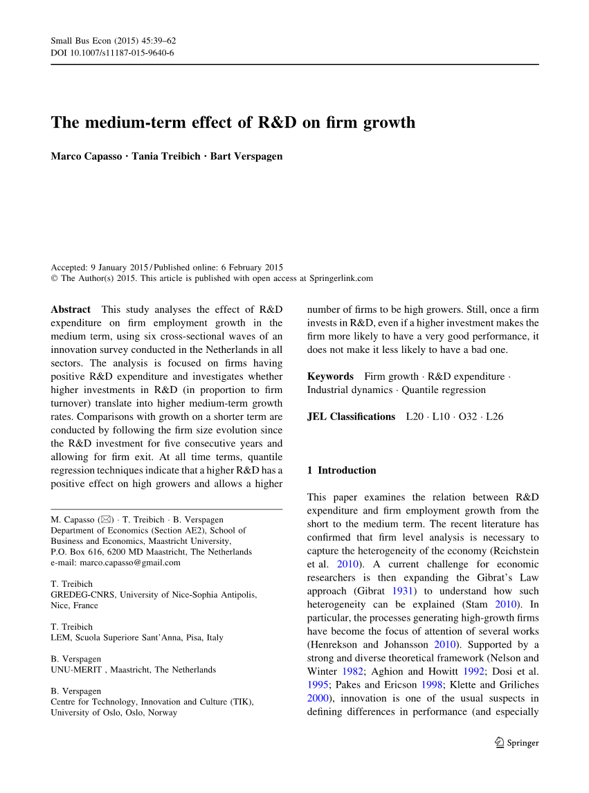 将研发、创新成功和企业绩效联系在一起的机制很大程度上归功于熊彼特的内生增长代表,根据熊彼特的内生增长代表,企业致力于创新,以便享受垄断性租金(Aghion和Howitt 1992;Klette和Griliches 2000)。前瞻性金融机构根据影响随机创新过程的预期回报率和回报率(intermsofsales或directlyintermsoffits)对其研究投入水平做出决定。创新的成功反过来会自动提高公司的盈利能力或生产力水平(Aghion和Howitt,1992年;Pakes和Ericson,1998年;Klette和Griliches,2000年)。然而,这种随机和优化的代表性受到了模型的挑战,在这种模型中,有限制的理性的代理人在不确定的环境中寻找更高效的技术,在这种环境中,创新对企业增长的影响本身是随机的(Nelson和Winter 1982)。在这样一个框架中,企业的创新能力是异质的,这不仅是因为它们的金融资源,而且因为它们获得技术机会的能力不同。研发必须被视为创新发现的新信息来源,同时也是开发企业利用外部知识能力的一种方式(Cohen和Levinthal,1989)。这种路径依赖性或创新累积性解释了创新集中在有限数量的公司手中(Dosi等人1995年),最终,持续表现优异的公司的存在(Capasso等人2014)。创新工作的不同结果促使对整个增长率分布进行分析,这取决于企业的研发支出水平。