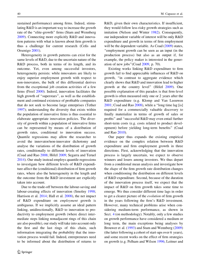 由于研发过程的不确定性,无论从长度还是结果来看,增长模式的异质性都可能存在于相同水平的研发中。然而,即使在成功的投资者中,异质性依然存在:尽管创新者与非创新者相比可能享有更高的就业增长,但这种差异的主要来源于少数公司(Freel 2000)的特殊创造就业活动。事实上,创新有助于“超级明星”的高速增长,也有助于建立和持续存在不寻求成为大企业的可盈利公司(Tether1997);因此,了解创新公司群体中存在的多样性对于制定适当的创新政策至关重要。创新企业群体内的增长多样性可以通过增长率的分布来表示,这是创新成功的条件。分位数回归可使研究人员避免创新者/非创新者,并根据不同创新水平,有条件地分析增长率分布的变化(Coad和Rao 2008;Ho–Lzl 2009;Segarra和Teruel 2014)。我们的研究采用分位数回归来研究不同水平的研发支出如何影响企业增长率的(有条件)分布,同时明确考虑研发投资的长度和结果的异质性。