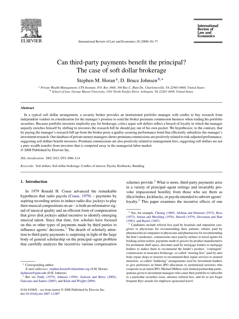 1979年,罗纳德·科斯提出了一个非凡的假设,即无线电支柱(Coase,1979) - 由有抱负的录音艺术家支付费用来诱导广播唱片骑师在空中演奏他们的音乐作品 - 既是音乐质量的信息信号又是一种有效的形式。为磁盘骑师提供补偿,增加了识别新兴音乐人才的动力。从那时起,很少有学者关注关于第三方为影响代理商决策而支付的此类或其他类型的付款。鉴于委托代理问题上的大量普通奖学金仔细分析了各种补偿方案提供的激励措施,学术界对第三方支付的缺乏令人惊讶。更重要的是,第三方支付在各种委托代理机构中出现,并且总是引起那些将其视为非法贿赂,回扣或暗示破坏代理人忠诚度的人的慷慨激昂的敌意。本文考察了一种形式的第三方支付 - 软美元经纪 - 在制度组合管理中的激励效应。