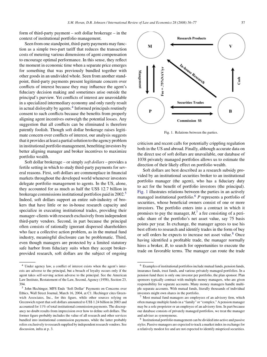 软美元经纪 - 或者仅仅是软美元 - 提供了一个肥沃的环境来研究第三方支付,原因有几个。首先,当投资者将投资组合管理委托给代理商时,软资金在整个发达国家的金融市场中司空见惯。仅在美国,它们占2002年经纪佣金机构投资组合中127亿美元的一半。事实上,软美元支持整个子行业的经纪人,他们几乎没有内部研究能力,专门从事机构交易,为经理客户提供独家第三方供应商的研究。其次,部分原因是委托人通常由面对集体行动问题的理性无知的分散股东组成,如共同基金行业,有意义的披露可能会产生问题。第三,尽管管理人员在接受经纪人提供的研究时受到有限的法定安全港的保护而受到信托诉讼的保护,但软美元仍是持续批评的主题,并且最近呼吁在美国和海外进行严厉的监管。最后,虽然没有关于直接使用软美元的准确数据,但我们的1038个私人管理投资组合数据库使我们能够估计它们对投资组合财富的可能影响的方向。 软美元最好被描述为机构证券经纪人向机构投资组合经理(代理人)提供的研究补贴,他有信托义务为证券投资者(委托人)的利益行事。图1说明了积极管理的机构投资组合中各方之间的关系。P代表证券组合,其受益所有人由一个或多个投资者组成。投资组合签订了一份合同,承诺向经理M,7支付一笔费用,该费用包括投资组合资产净值的定期份额,比如说每年75个基点。作为交换,经理同意尽最大努力以买入或卖出订单的形式研究和识别他希望增加净资产价值的交易。一旦确定了有利可图的交易,经理通常会聘请经纪人B来寻找以优惠条件执行交易的机会。经理可以通过折扣经纪人进行交易,折扣经纪人收取每股约2美分的“仅执行”佣金率,但在绝大多数情况下,他将通过机构经纪人以更高的佣金率接近每股6美分。在典型的软美元安排中,机构经纪人向经理提前预付信用额度,以便向独立供应商V支付特定金额的研究账单。作为交换,经理承诺以优惠佣金率发送经纪人未来交易举例来说,如果经理同意向经纪人发送足够的交易(在这种情况下为600万股),在下一季度以每股6美分的价格向经理提供180,000美元的研究信用,则可以为经理提供180,000美元的研究信用。经纪佣金,显然超过了必要的经纪人的执行成本。从这个意义上说,经理被称为“支付”经纪人费用的研究费用。