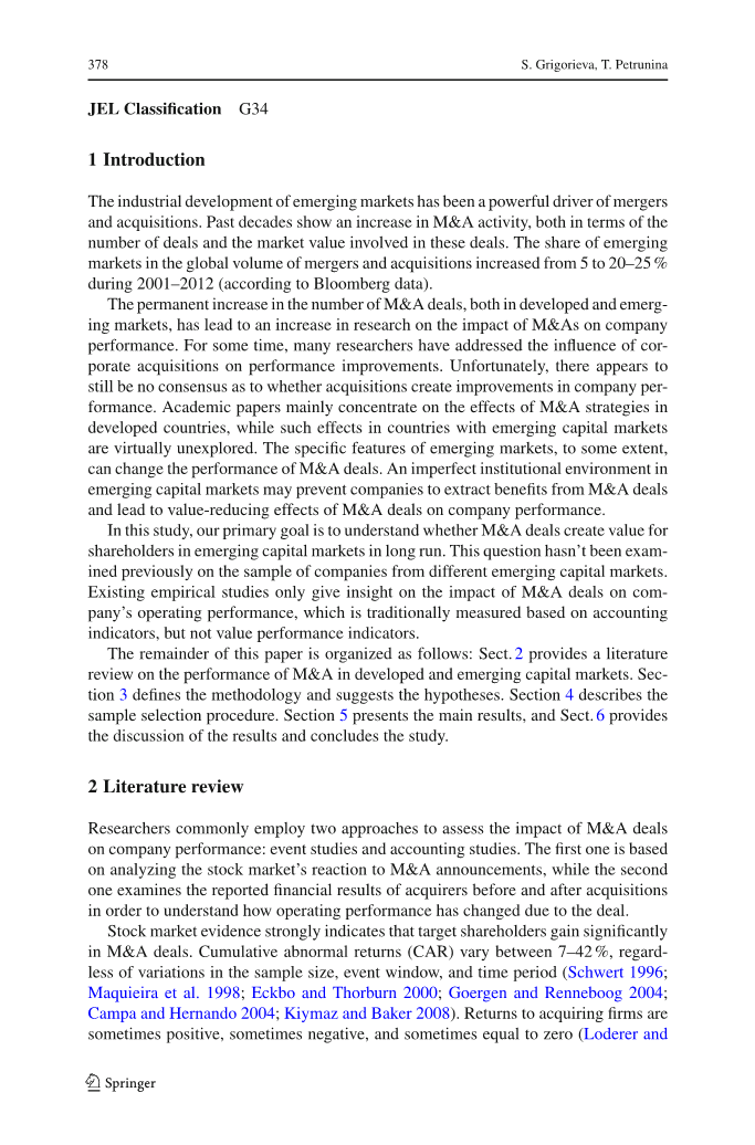 学术论文主要集中在发达国家的并购战略的影响,而新兴资本市场的这些影响几乎未被探索。在印度,中国,马来西亚,斯洛文尼亚,波兰,罗马尼亚,土耳其和新兴市场的国家中,只有几篇论文研究了并购对公司业绩的影响(Pawaskar 2001;Rahman和Limmack 2004; Trojanowski 2008;Changqi和Ningling 2010;Mantravadi和Reddy 2008;Kumar 2009;Gregoric和Vespro 2009;Akben-Selcuk和Altiok-Yilmaz 2011;Leepsa和Mishra 2012;Yen等2013;Narayan和Thenmozhi 2014)。