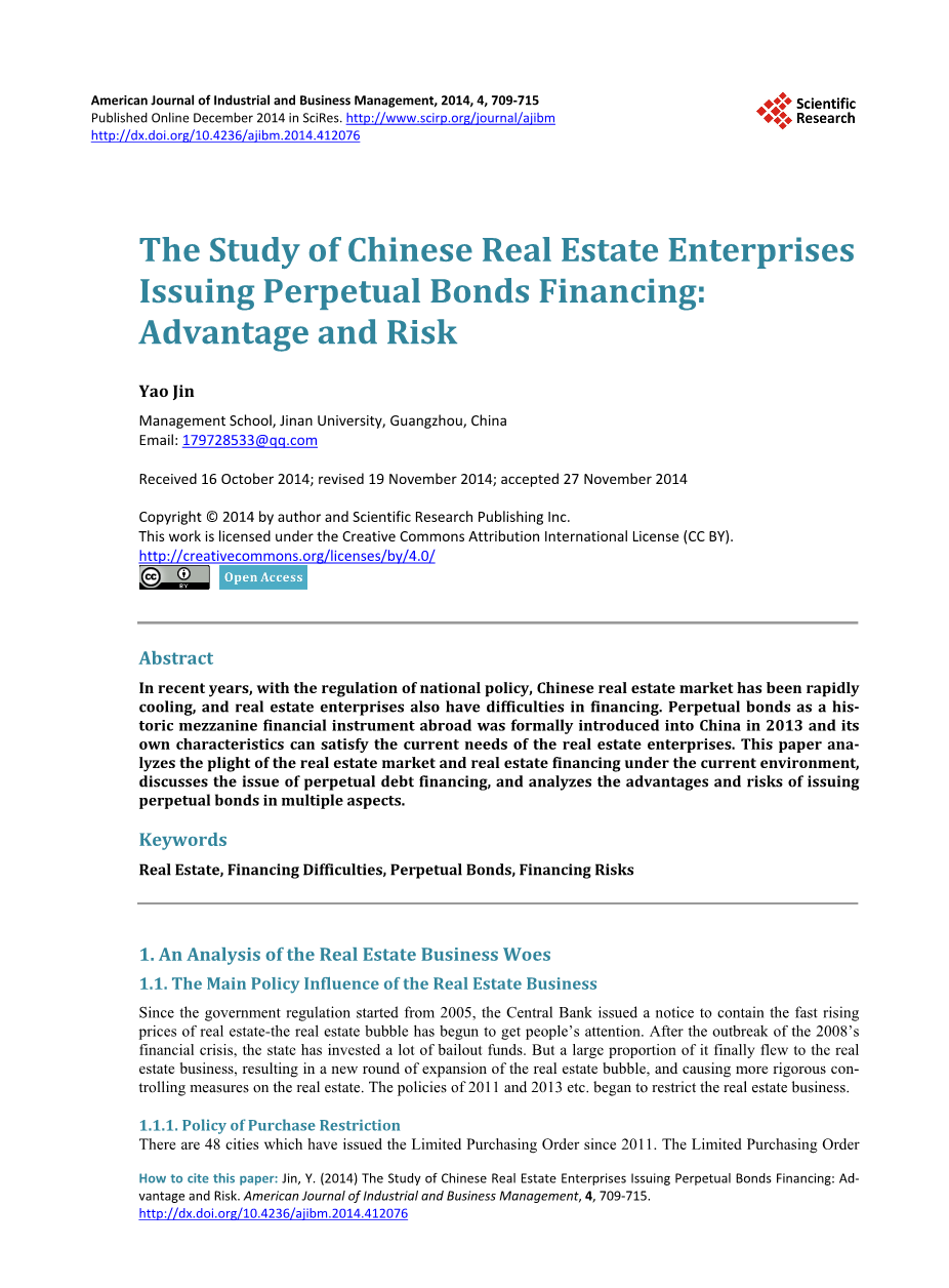 摘要 近年来,随着国家政策的调控,中国房地产市场一直在迅速降温,房地产企业也难以融资。永久债券作为国外历史性的夹层金融工具于2013年正式引入中国,其自身特点可以满足当前房地产企业的需求。本文分析了当前环境下房地产市场和房地产融资的困境,探讨了永续债务融资问题,从多个方面分析了发行永续债券的优势和风险。