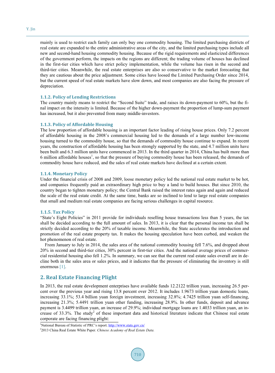2011年“国家八项政策”规定,转售房屋交易的个人不得超过5年,税额按照全额销售额确定。2013年,显然应根据应纳税所得额的20%严格确定个人所得税。同时,国家加快推出和推广房地产税。这使得住房投机得到了遏制,并削弱了房地产的火爆现象。2014年1至7月,全国商品房销售面积下降7.6%,二线和三线城市下降约20%,一线城市下降30%。全国商品住宅平均价格也下跌1.2%。总之,我们可以看到当前房地产销售总体上在销售区域或销售价格都在下降,这表明消除库存的压力仍然很大[1]。
