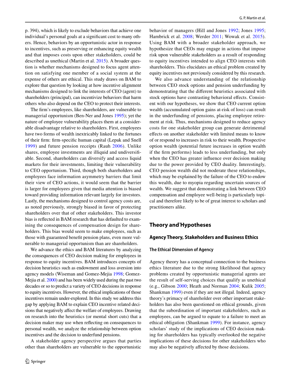利益相关者机构的观点认为,除了股东以外的各方都容易受到管理者的机会主义行为的影响(Hill和Jones 1992;Jones 1995;Hambrick等人2008年;Werder 2011年;Wowak等人2015)。使用具有更广泛利益相关者方法的BAM,我们假设CEO可能会采取行动,将风险强加给易受攻击的利益相关者,从而响应旨在使CEO利益与股东保持一致的股权激励措施。这说明了由本研究之前未考虑的股权激励所产生的伦理问题。