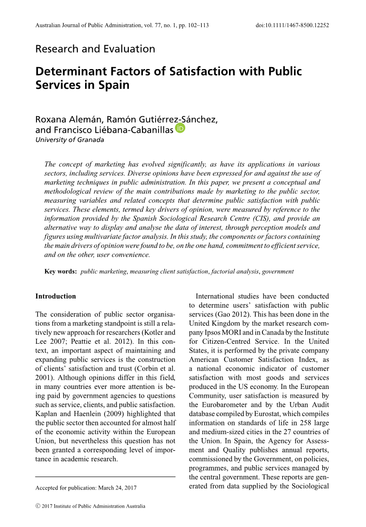 本文的目的是分析影响客户对公共服务满意度的关键驱动因素,综合考虑社会学研究中心(CIS)发布的公共服务质量评估报告,并应用多因素分析的方式,依据所取得的成果,从中得出的结论,提出一些使公共机构能够提高对公共服务的满意度的建议。