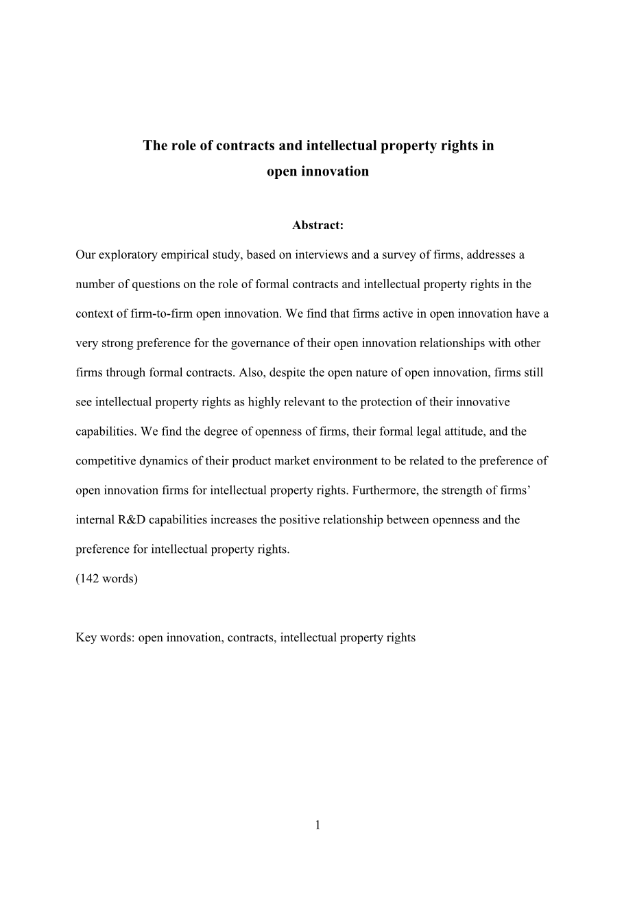 在企业开放创新的背景下,我们基于对企业的访谈和调查的探索性实证研究,针对正式合同和知识产权的作用提出了若干问题。我们发现活跃在开放创新领域的公司非常倾向于通过正式的合同来管理他们与其他公司的开放式创新关系。此外,尽管开放式创新具有开放性,企业仍然认为知识产权与保护其创新能力高度相关。我们发现企业的开放程度、其正式的法律态度以及其产品市场环境的竞争态势与开放式创新公司对知识产权的偏好有关。此外,企业内部研发能力的提高也增加了开放性与知识产权偏好之间的正向关系。