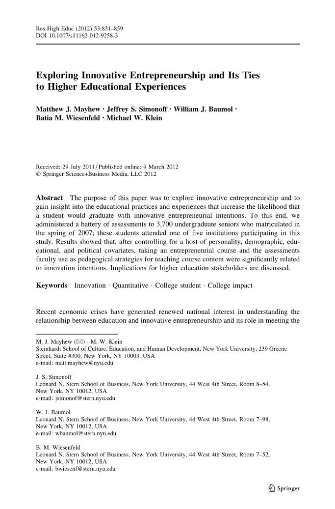 (Matthew J. Mayhew; Jeffrey S. Simonoff; William J. Baumol; Batia M. Wiesenfeld Michael W. Klein)