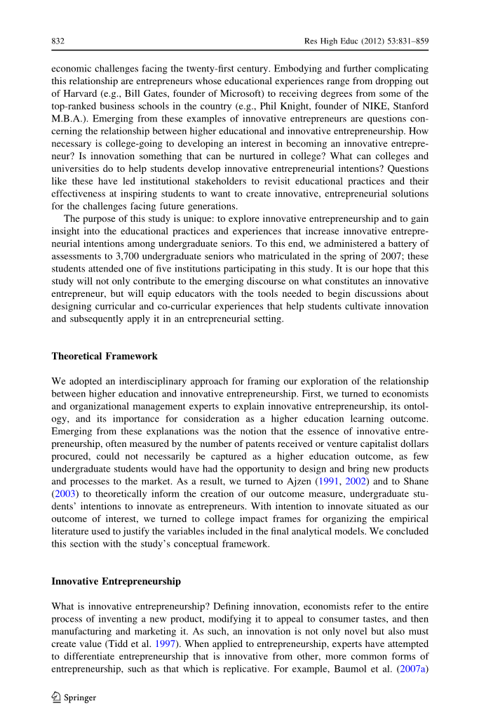 我们采用跨学科的方法来构思我们对高等教育与创新企业家关系的探索。首先,我们转向经济学家和组织管理专家,解释创新创业精神,本体论及其作为高等教育学习成果的重要性。从这些解释出现的观点是,创新企业精神的本质(通常以获得的专利或风险资本金获得的数量来衡量)的本质不一定能够作为高等教育成果被捕获,因为很少有本科生有机会设计并将新的产品和流程推向市场。因此,我们转向了Ajzen(1991,2002)和Shane(2003),从理论上告诉我们创造了我们的成果指标,即本科学生作为企业家创新的意图。我们打算将创新作为我们感兴趣的结果,转而采用大学影响框架来组织用于证明最终分析模型中所包含变量的经验文献。我们用本研究的概念框架总结了本节。