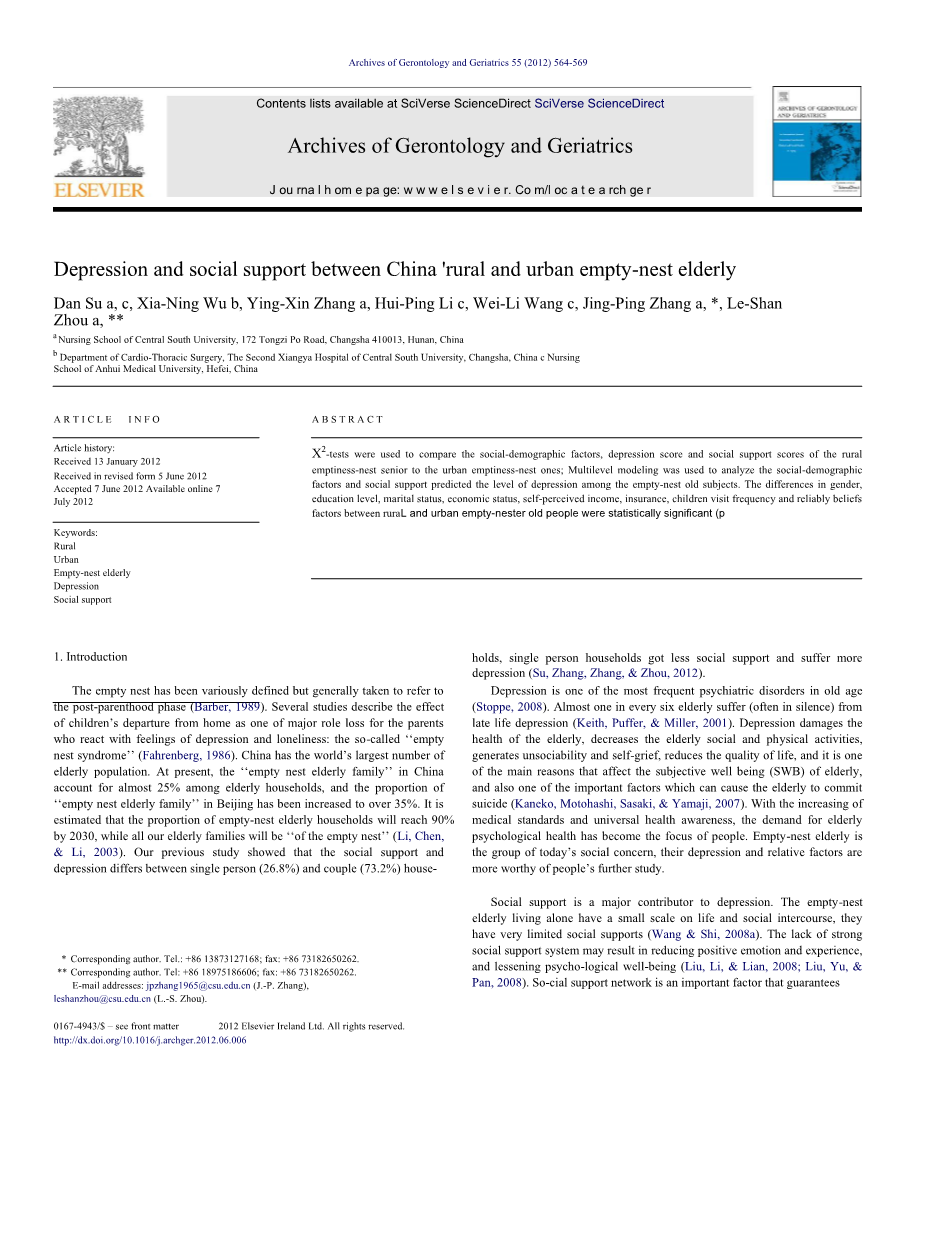 Depression and social support between China rural and urban empty-nest elderly(节选)