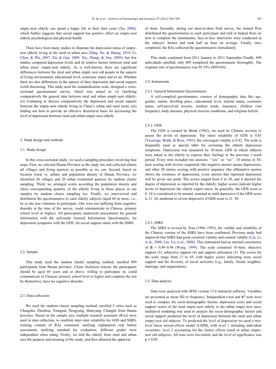 In this cross-sectional study, we used a sampling procedure involving four steps. First, we selected Hunan Province as the study site and collected almost all villages and living quarters as possible as we can. Second, based on location (rural vs. urban) and population density of Hunan Province, we identified 20 villages and 20 urban residential quarters by random cluster sampling. Third, we arranged scales according the population density and chose corresponding quantity of the elderly living in those places as our samples by random cluster sampling too. Finally, we interviewed and distributed the questionnaires to each elderly subjects (aged 60 or more, i.e., he or she was voluntary to participate, who were not suffering from cognitive disorder at the time of the survey, could communicate in Chinese, primary school level or higher). All participants underwent assessments for general information with the self-made General Information Questionnaire, for depression symptoms with the GDS, for social support status with the SSRS.