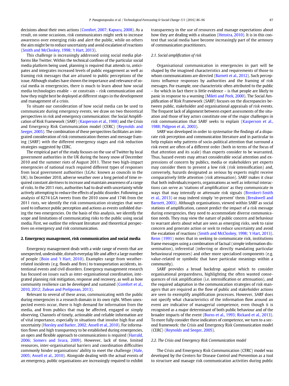 本研究的实证部分着重于2010年12月的雪灾和2011年8月的暴乱事件期间,英国地方政府机构对Twitter社交媒体的使用。这两次对全国范围影响重大的突发事件,要求当地政府(LGA:英国的议会)采取不同类型的应对措施。2010年12月,长期的恶劣天气要求民众不断保持警觉,以增强并保持对各种风险的意识。在2011年的骚乱中,当局政府必须积极应对各种不确定性,同时努力减少公共秩序的负面影响。在分析了2010年雪灾中的8274条LGA推文和2011年暴乱事件中的1746条推文之后,我们确定了风险沟通策略,这些策略用于在两次突发事件发生时影响公众的感知和行动。在此分析的基础上,我们确定了使用社交媒体向公众传达风险的范围和其存在的局限性。首先,我们概述了有关突发事件风险沟通的相关文献和理论观点。
