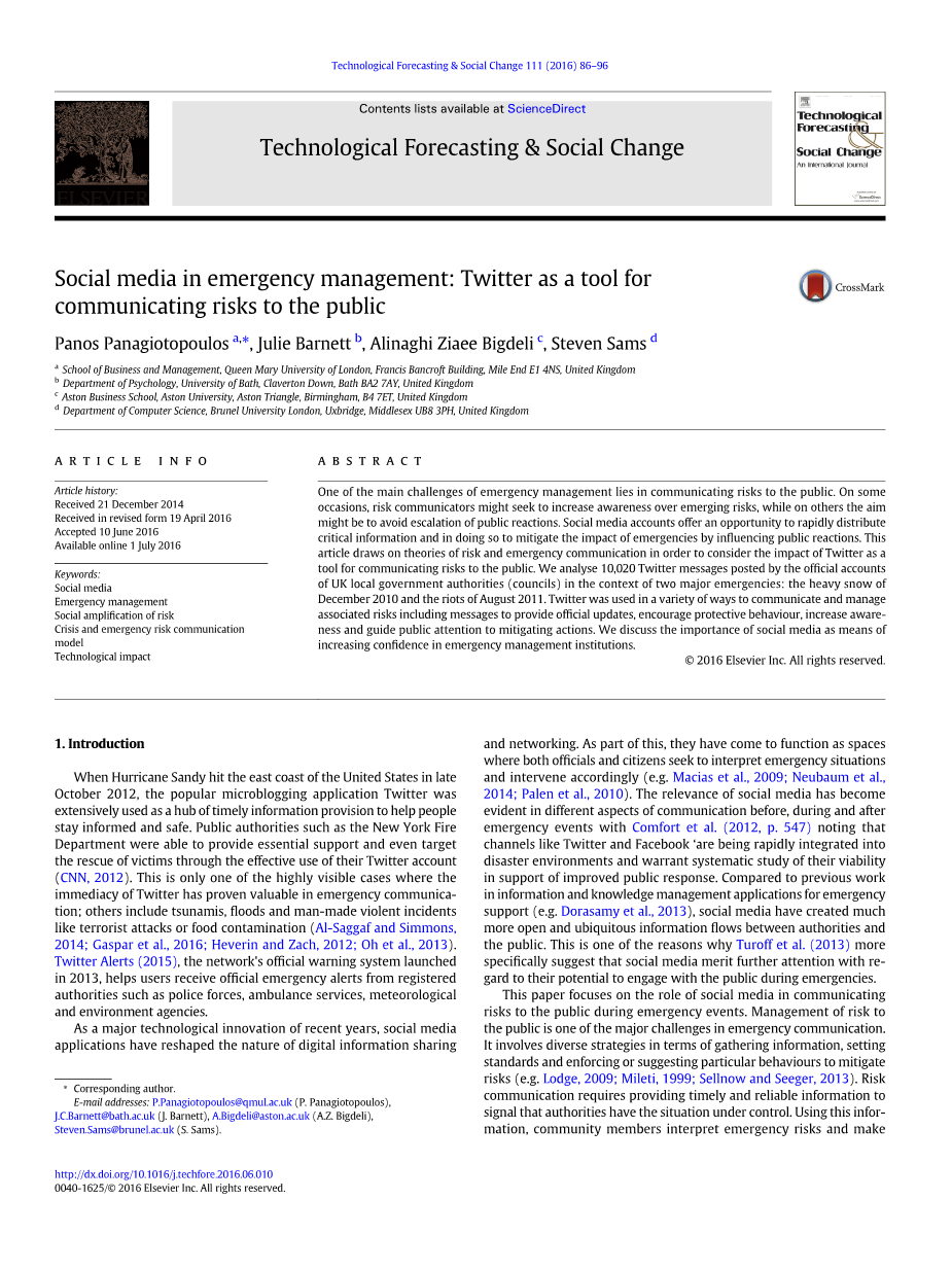 社交媒体作为近年来的一项重大技术创新应用程序,改变了数字信息共享和网络的本质。为此,他们已成为官员和公民沟通突发事件信息并据此进行干预的平台(如Macias等,2009;Neubaum等,2014;Palen等,2010年)。社交媒体在突发事件发生前、中、后三个阶段在沟通方面的相关性也日益明显。Comfort等(2012年,第547页)指出Twitter和Facebook等渠道已迅速整合到灾难环境中,因此有必要对其生存能力进行系统的研究,以支持引导公众对突发事件的反应。与先前在信息和知识管理应用程序中用于紧急支持的工作相比(例如Dorasamy等人,2013年),社交媒体在有关部门和公众之间营造了更多开放和普遍的信息流。这就是为什么Turoff等(2013年)认为社交媒体在突发事件紧急情况下与公众沟通的潜力值得进一步关注。