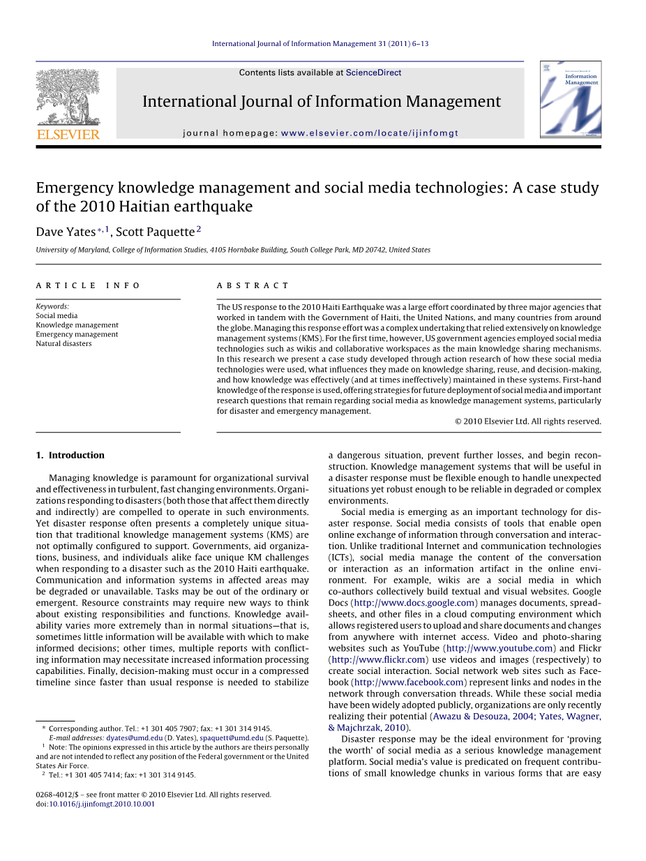 这项研究的目的是验证上述断言。2010年的海地地震是一场无法形容的悲剧,世界动员了惊人的响应。有史以来第一次,美国政府广泛依赖社交媒体来协调合作,包括美国国际开发署(USAID),美国国务院和美国武装部队之间的响应。作者获得了前所未有的参与和研究这种协调响应的机会,并了解在有效管理知识的响应过程中如何使用社交媒体技术。