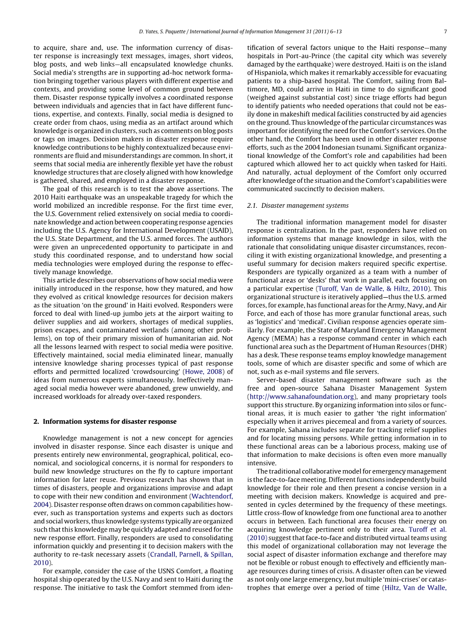 本文描述了我们对社交媒体最初如何在响应,它们如何成熟,以及它们如何随着海地的“实地”情况的演变而成为决策者的关键知识资源。在他们的人道主义援助的主要任务之外,响应者被迫在机场处理排队的大型喷气式飞机,等待运送物资和援助工作人员,这里是医疗用品短缺、监狱逃逸和受污染的湿地(以及其他问题)。并非所有关于社交媒体的经验教训都是积极的。有效的维护,及社交媒体消除了过去响应工作中典型的线性,手动密集型知识共享流程,并允许本地化的“众包”(Howe,2008))同时来自众多专家的想法。然而,无效管理的社交媒体被抛弃,它们变得笨拙,并且对已经过度负担的响应者增加了工作量。