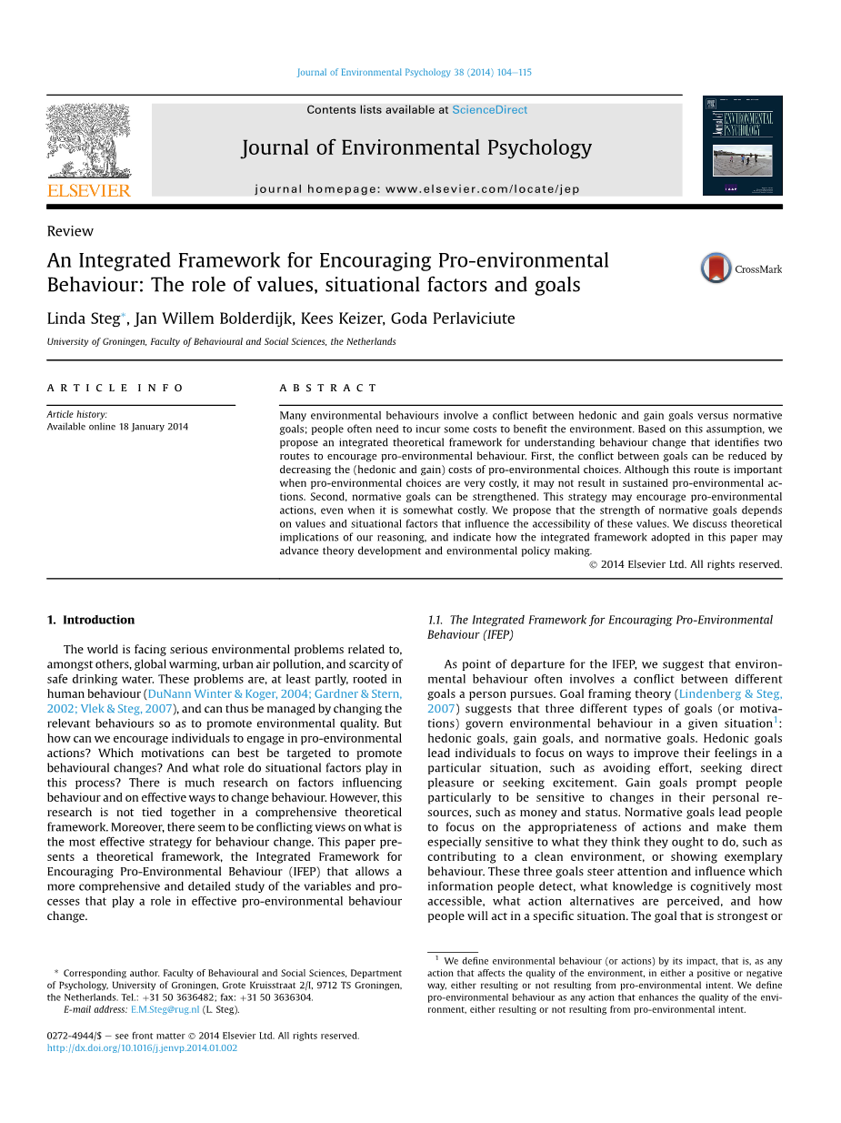 世界面临着严重的环境问题,例如全球变暖、城市空气污染和饮用水短缺。这些问题部分源于人们的行为(DuNann Winter amp; Koger, 2004; Gardner amp; Stern, 2002; Vlek amp; Steg, 2007),因此可以通过改变相关行为来改善环境质量。然而如何鼓励个体参与环保行为?哪种动机最能促进行为改变?情境因素在这个过程中起到什么作用?已有大量现有研究对行为影响因素和方法进行讨论。然而,该研究并没有一个完整的理论框架,此外,对于改变行为的有效策略存在不同意见。本文提出了一个理论框架,即鼓励亲环境行为综合框架(Integrated Framework for Encouraging Pro-Environmental Behavior, IFEP),该框架允许对有效改变亲环境行为的因素和过程进行全面和详细的研究。
