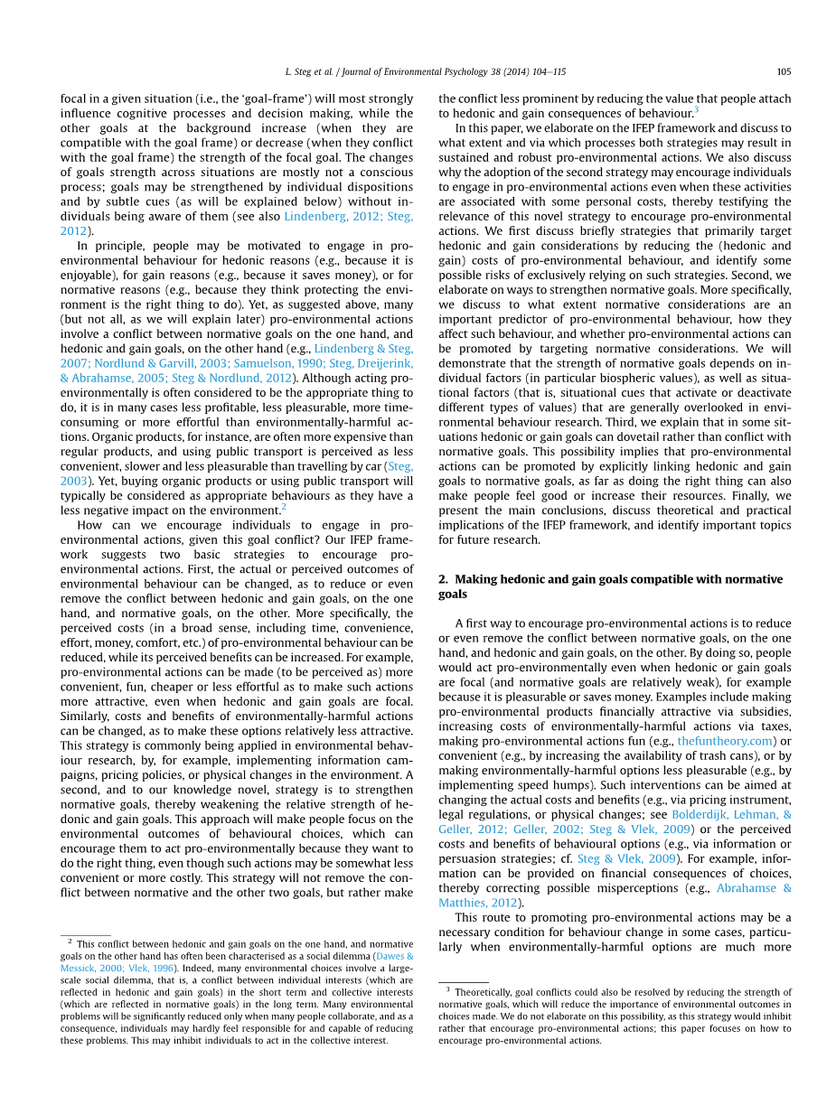 在本文中,我们将详细介绍IEFP体系,并讨论这两个策略在多大程度上以及以何种方式促进持续的(sustained)、稳健的(robust)亲环境行为。我们还将讨论为什么采用第二种策略会鼓励个体参与亲环境行为,即使这些活动与某些个人成本相联系,从而证明了这种新颖的策略对鼓励亲环境行为的重要性。我们首先简要讨论针对享乐和获取的策略,该策略的方法为减少亲环境行为的(享乐和获取)成本,并确定此类策略的潜在风险。其次,我们将详细介绍增强规范目标的方法。更具体地,我们将讨论规范因素在多大程度上是亲环境行为的重要预测指标,它们如何影响这种行为,以及相应规范因素是否可以促进亲环境行为。我们将证明规范目标的强度取决于环境行为研究中通常忽略的个体因素(特别是生态价值)、情境因素(激发或抑制不同价值观的情境因素)。然后,我们将解释在某些情境下享乐和获取目标会与规范目标一致而非冲突,这种可能性意味着通过将享乐目标、获取目标与规范目标明确联系起来,可以促进亲环境行为,以及做正确的事可以使人们感觉良好或增加他们的资源。最后,我们提出了主要结论,讨论了IFEP体系的理论和实际意义,并确定了未来研究的重要主题。
