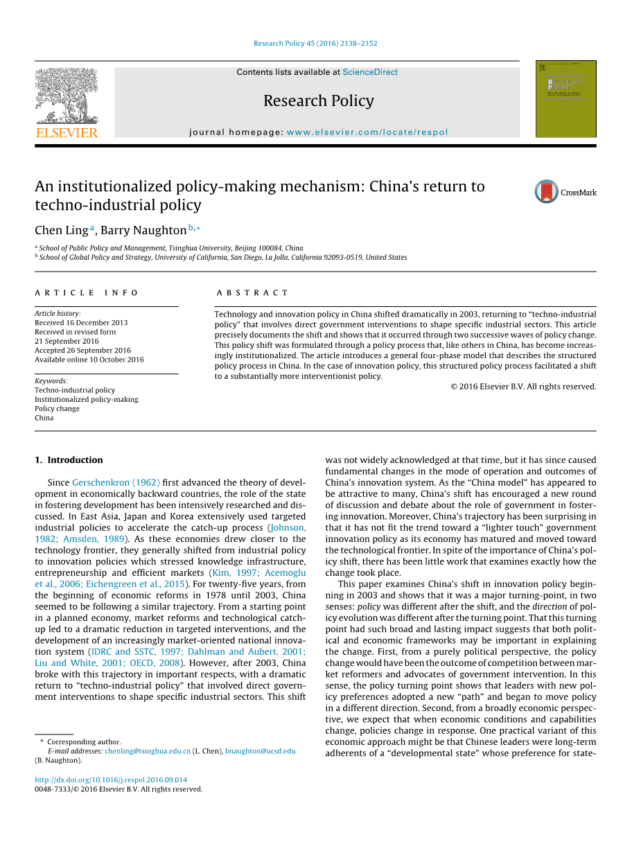 自从高斯克龙(1962)先后发展经济落后国家发展理论以来,国家促进发展的作用得到了深入的研究和讨论。在东亚,日本和韩国广泛采用有针对性的工业政策来加快追赶进程(Johnson,1982;Amsden,1989)。随着这些经济体越来越接近技术前沿,他们普遍从工业政策转向了强调知识基础设施,创业和高效市场的创新政策(Kim,1997;Acemoglu et al,2006;Eichengreen et al,2015)。二十五年来,从1978年到2003年的经济改革开始,中国还要遵循类似的轨迹。从计划经济的起点,市场改革和技术追赶导致有针对性的干预措施大幅减少,以及日益市场化的国家创新体系的发展(IDRC和SSTC,1997;Dahlman和Aubert,2001; Liu and White,2001;OECD,2008)。然而,2003年以后,中印在这个轨迹上处于重要方面,大幅度地回归到“产业技术政策”,涉及直接的政府干预来塑造特定的工业部门。当时这种转变并没有得到广泛的认可,而是由此引发了中国创新体系的运作模式和成果的彻底变化。由于“中国模式”似乎对许多人有吸引力,中国的转变鼓励了新一轮关于政府在促进创新中的作用的讨论和辩论。此外,中国的轨迹已经令人惊讶,因为它的经济已经成熟并向技术前沿迈进,不符合“轻触摸”政府创新政策的趋势。尽管中国的政治转型非常重要,但是几乎没有什么工作能够准确地探讨这种变化的发生。