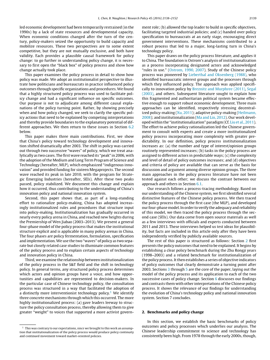 本文作了三个主要贡献。 首先,我们展示了2003年以后中国的科技发展和创新政策发生了巨大的变化。政策的转变是通过两个连续的政策浪潮进行的,我们把这两个方面的理论分为两种。第一波在2006年达到“高峰”,随着“中长期科学技术计划”(以下简称“MLP”)的实施,强调“土着创新”,为十六个大型项目提供资金。第二波在2010年底达到顶峰,其中有Strate-gic新兴产业(以下简称SEI)的计划。经过两个高峰期,政策稳定下来。 我们记录了这一变化,并说明了这一点,从而有助于了解中国的革新政策和国家创新体系。