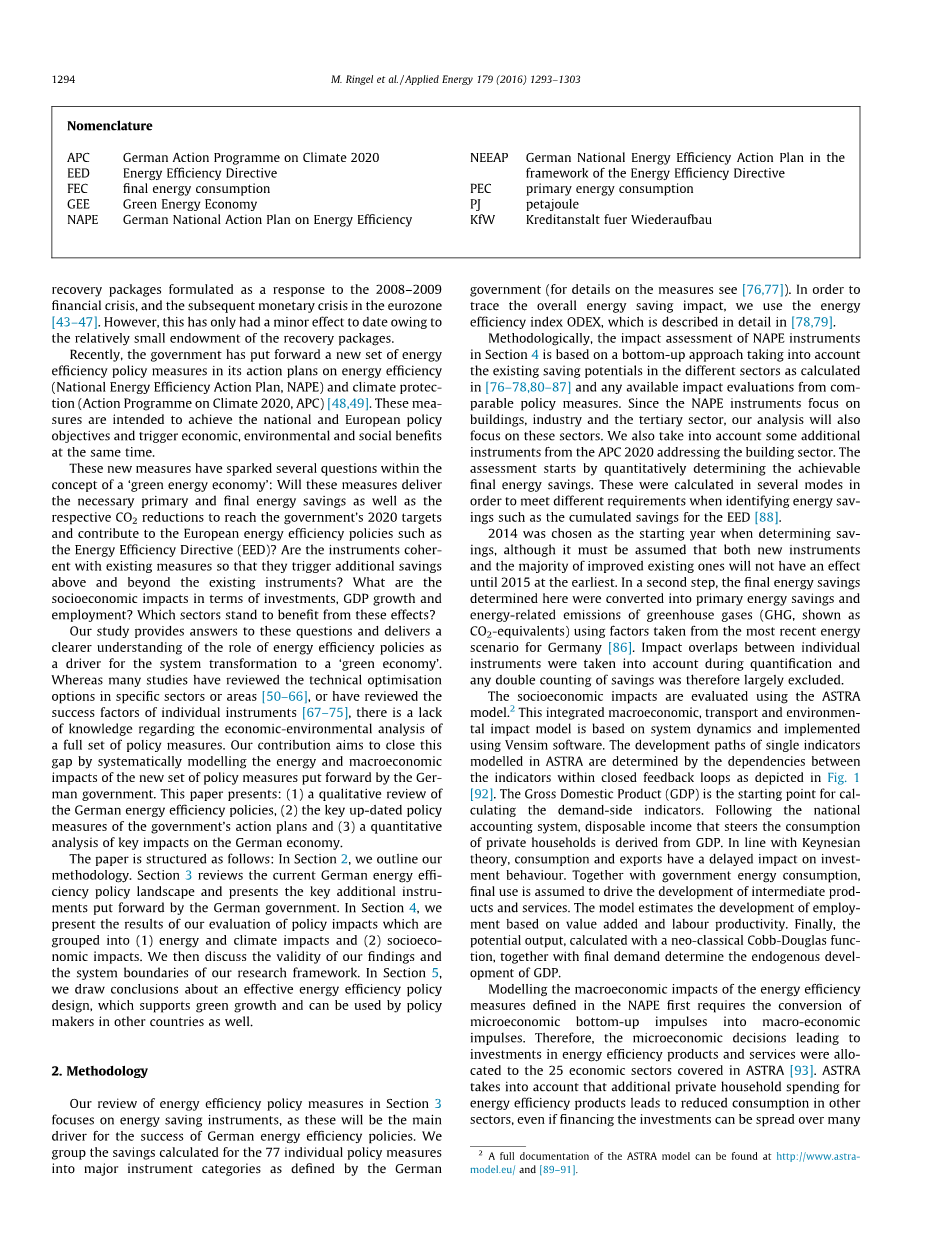 本文的结构如下:在第2节中,我们概述了我们的方法。第3节回顾了德国目前的能源效率政策格局,并提出了德国政府提出的关键手段。 在第4节中,我们介绍了我们对政策影响进行评估的结果,分为(1)能源和气候影响以及(2)社会经济影响。 然后,我们将讨论我们的研究结果的有效性和我们的研究框架的系统边界。 在第5节中,我们得出结论,有效的能源效率政策设计,支持绿色增长,并可以由其他国家的政策制定者使用。