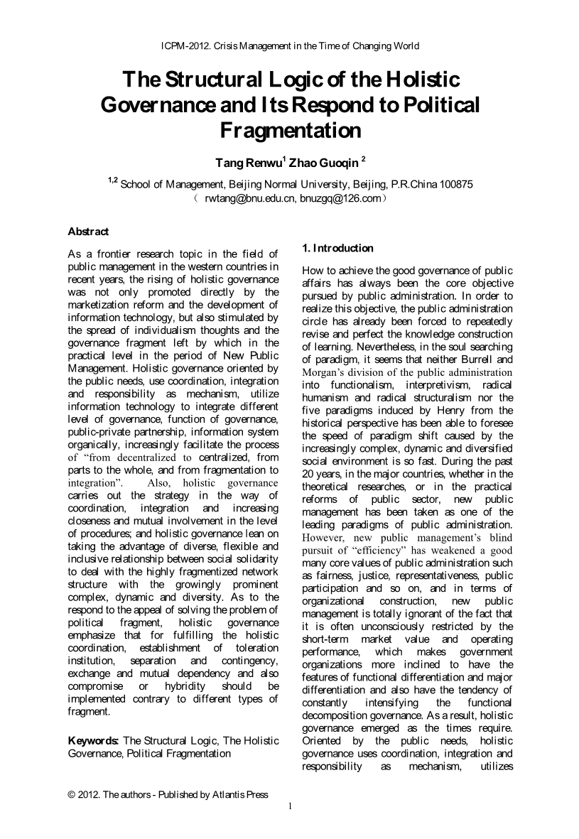 [摘要]整体治理作为公共治理领域的前沿研究课题,近年来随着信息技术的发展和信息技术的发展,在新公共管理时期,个人主义思想和管理思想的不断扩展,在实践层面上受到了推动。以公共治理为导向,以公共需求为导向,以协调、整合和责任为机制,利用信息技术将不同层次的治理、治理功能、公私伙伴关系、信息系统有机地融合起来,日益促进了“从分散到集中,从零部件到整体,从分散到整合”的过程。同时,整体性治理中进行协调的策略,在程序层面整合和增加亲密和共同参与;整体性治理依靠利用多样化,灵活和包容的关系之间的社会团结与日益突出的复杂处理高度碎片化的网络结构、动态性和多样性。为应对解决政治问题的呼吁片段,整体性治理强调实现整体协调,宽容制度建立、分离和应急,交流和相互依赖和妥协或杂合应实施与不同类型的片段。