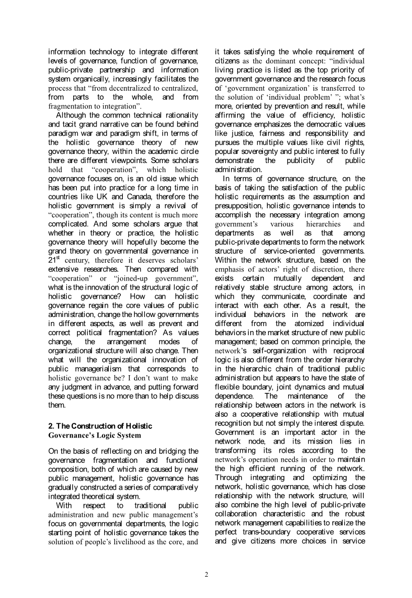 在理论上,作为一种新的范式的领域中公共管理,整体性的上升治理不同于新公共管理这是从角度经济和社会的理解,以及它的背景是全球经济一体化而所需的促进效率,但是,在某种程度上,整体可以理解技术角度。从方法论,传统的官僚制最近新的公共管理范式采用了个人主义的方法论,导致严重的分裂和部门中心主义,不符合复杂、动态、多样的“真实世界”,引发公众不满和愤怒。在相反,整体治理丢弃单方面关注的政府,并与信息发展的帮助技术在数字时代的基础上的思考方法论,通过训练和巩固协调机制,一体化机制,信任与问责网络治理机制结构,利用优势比较力形成的强大力量和公共的独家资源管理具有多样性和异质性。任何改革尝试表达的尝试人们期待着革命,每一个都有新模式本身显示了新的承认人民的问题政府。一个特定的因果关系。这是必要的我们要了解问题的原因复杂的政治改革,但是,任何尝试进行复杂的社会政治机构必然过于简单。相对于传统的公共行政和新公共管理,整体治理理论有机会成为一个重要的范式转变,但是,它也面对无法估量的挑战,它的定义,概念,假设,策略,可行性需要通过广泛的讨论,而且这个过程可能是漫长而有争议的。同时,作为一种新的公共模式行政,整体治理理论只是提供了一个替代方案,没有成为一个可行的万能药在任何时间和地点。建立和完善系统建设也可能是一个长期的