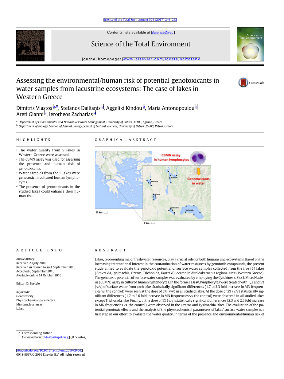 湖泊是主要的淡水资源,对人类和生态系统都起着至关重要的作用。 基于国际社会对遗传毒性化合物污染水资源兴趣的增加, 本研究目的在于评估从五(5)个湖泊采集的地表水样本的遗传毒性潜力。(Amvrakia, Lysimachia, Ozeros, Trichonida, Kastraki)位于艾托洛阿卡尼亚地区 (希腊西部).