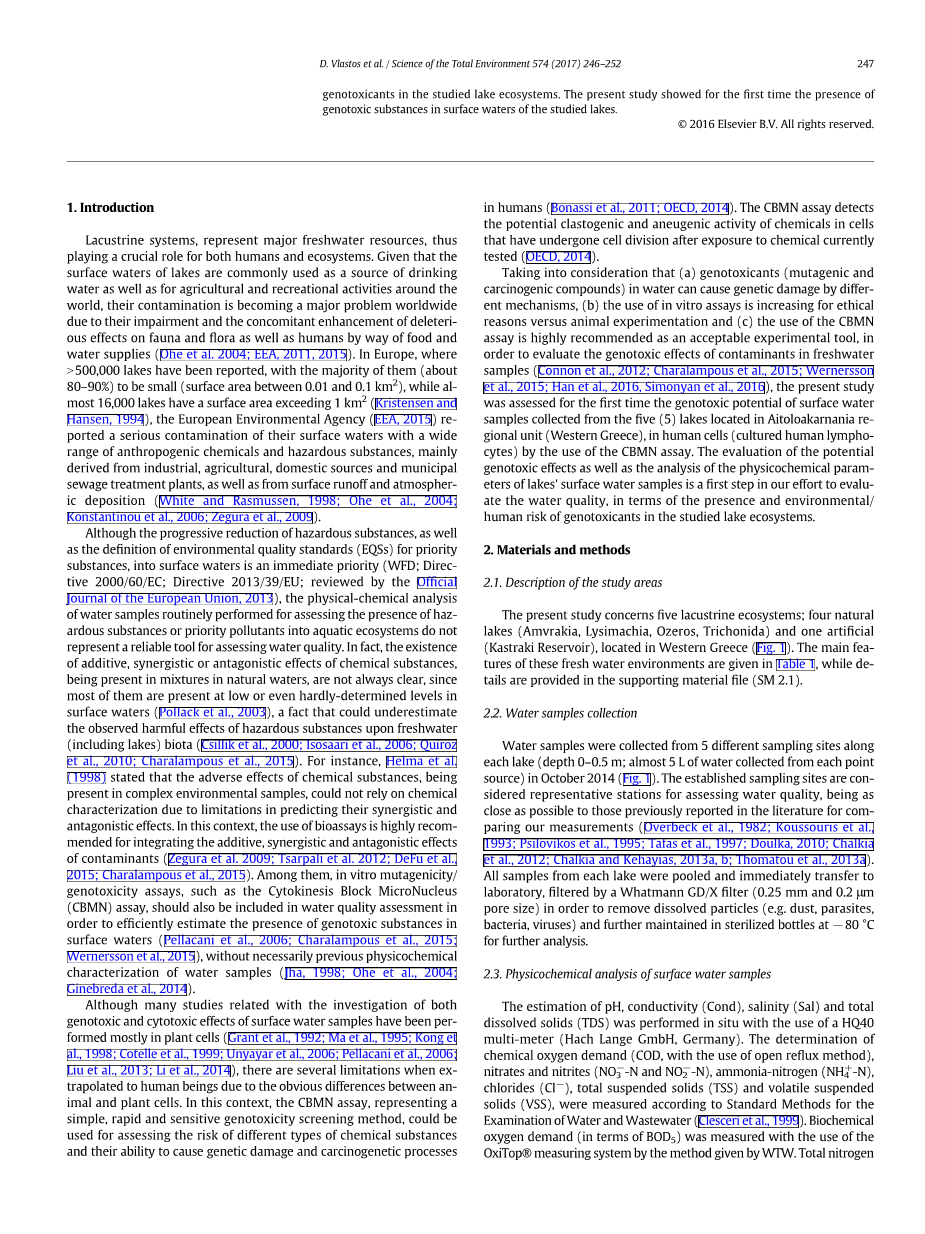 尽管许多与调查地表水样品的遗传毒性和细胞毒性效应有关的研究大多是在植物细胞中进行的(Grant等人,1992年;Ma等人,1995年;K。 ng et al., 1998; Cotelle et al., 1999; Unyayar et al., 2006; Pellacani et al., 2006; Liu et al., 2013; Li et al., 2014), 由于动物细胞和植物细胞之间的明显差异,将其外推到人身上有几个局限性。在此背景下,cbmn试验代表了一种简单、快速和敏感的遗传毒性筛选方法,可用于评估不同类型化学物质及其abi的风险。 在人类中造成遗传损害和致癌过程(Bonassi等人,2011年;经合组织,2014年)。CBMN分析检测了在目前被测试的化学品暴露后细胞分裂后的化学物质潜在的碎裂性和非整性活动(经合组织,2014年)。考虑到(A)水中的基因毒物(致突变性和致癌性化合物)可通过不同的机制造成遗传损伤,(B)体外试验的使用越来越多。 强烈推荐使用cbmn检测作为一种可接受的实验工具,以评估fre中污染物的遗传毒性效应。 水样(Connon等人,2012年;Charalampous等人,2015年;Wernersson等人,2015年;han等人,2016年;Simonyan等人,2016年),本研究首次对遗传毒性po进行了评估 用CBMN法从位于艾托洛卡纳尼亚地区单位(希腊西部)的五(5)个湖泊采集人体细胞(培养的人淋巴细胞)中的地表水样本 。评估潜在的遗传毒性效应以及分析湖泊地表水样品的物理化学参数是我们评价水质的第一步。 在所研究的湖泊生态系统中,遗传毒物的存在及其对环境/人类的风险。
