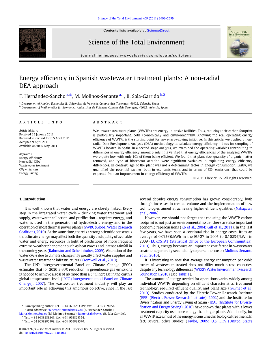 西班牙污水处理厂的能源效率:一种非径向DEA方法外文翻译资料