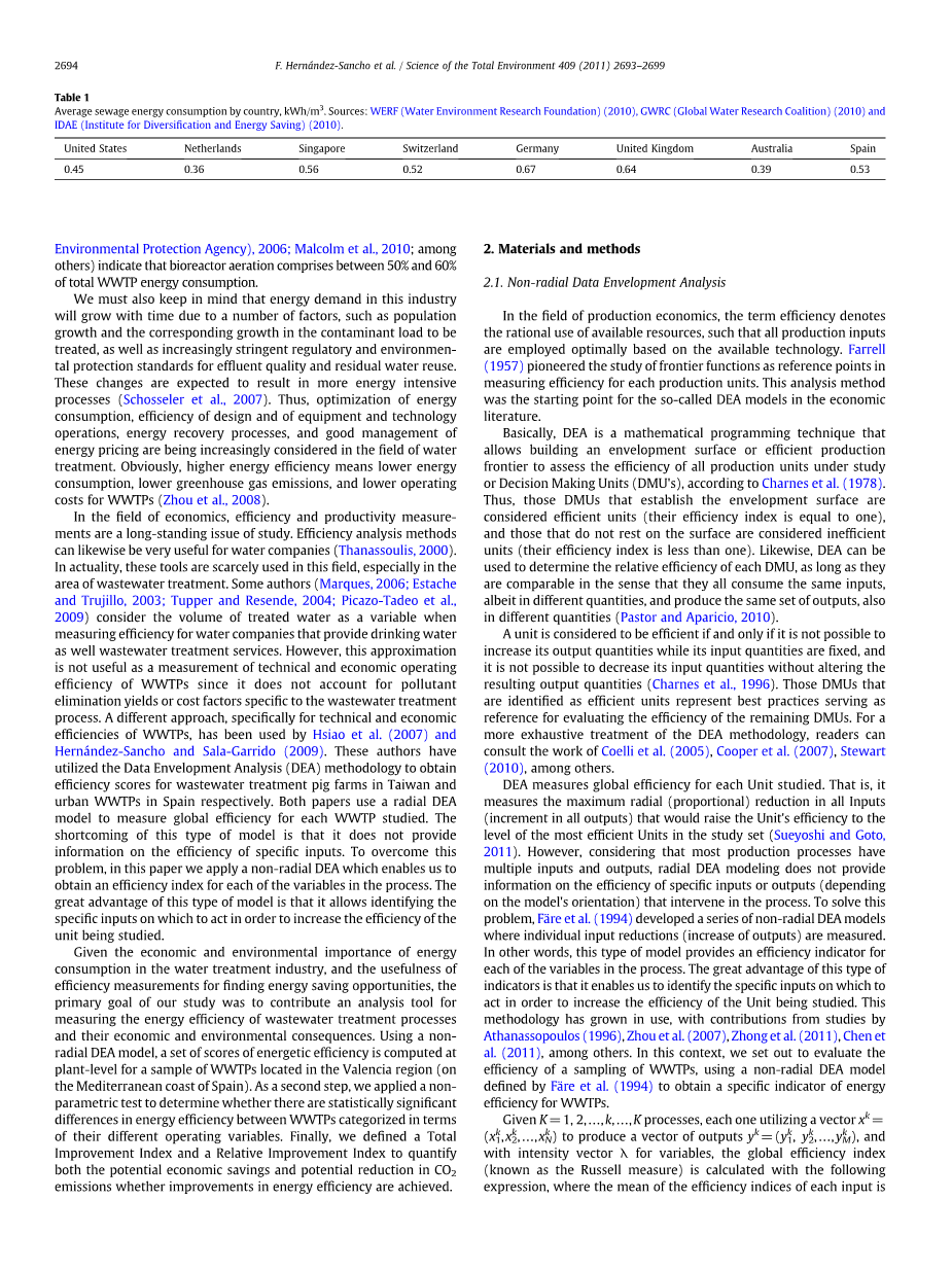 在经济学领域,测算生产率是学界长期研究的一个问题。效率分析方法同样对于自来水公司很有用(Thanassoulis,2000)。在实际应用中,这些工具在该领域的应用很少,尤其是在污水处理领域。部分作者(Marques,2006;Estache和Trujillo,2003;Tupper and Resende, 2004))在为提供饮用水和废水处理服务的水公司测量效率时,将待处理的废水量作为一个变量。然而,这并不能作为衡量污水处理厂技术和经济运行效率的方法,因为它没有考虑到污水处理过程中特定的污染物可能会消除产量和成本因素带来的影响。Hernandez-Sancho和Sala-Garrido(2009)采用了一种不同的方法,专门研究污水处理工厂的技术和经济效率。本研究采用数据包络分析法(DEA),对台湾养猪场污水处理效率与西班牙城市污水处理厂污水处理效率进行了比较。两篇论文使用了径向DEA模型来测量每个污水处理厂的综合效率。这种模型的缺点是它没有提供关于特定输入效率的信息。为了克服这一问题,本文采用了非径向DEA方法,使我们能够得到过程中每个变量的效率指标。这种模型的最大优点是,它可以确定具体的投入,以便提高正在研究的单个指标的效率。