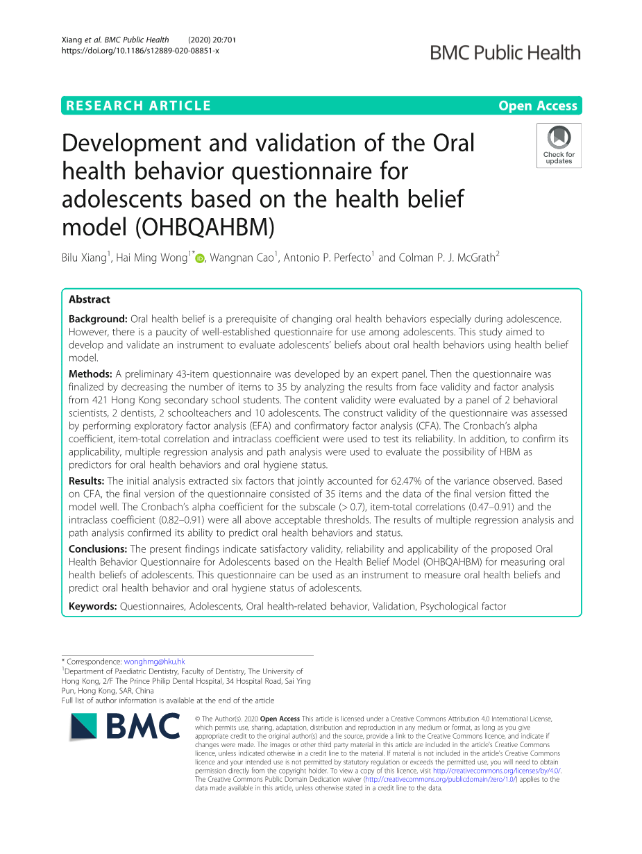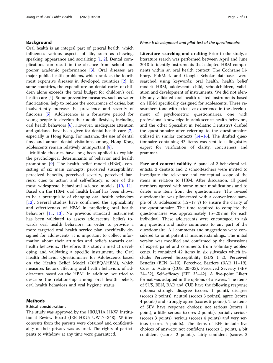 邀请了2名行为科学家,2名牙医和2名教员组成小组,调查了与HBM相关的项目的相关性和概念范围。经过讨论,所有小组成员都同意进行一些小的修改,并从问卷中删除一项。修订后的问卷以10名青少年(12至17岁)的便利样本进行了预调查,以确保问卷的清晰度。每个人完成问卷所需的时间约为15-20分钟。鼓励这些青少年提出任何问题,并对问卷的任何部分发表评论。所有评论和建议都被认为可以消除潜在的误会。最初的版本经过专家小组的讨论和自愿青少年的评论进行了修改和确认。它包含六个子量表中的总共42个项目,包括:感知易感性(SUS 1-2),感知利益(BEN 3-10),感知障碍(BAR 11-19),提示因素(CUE 20-23),感知严重性(SEV 24–32),自我效能感(EFF 33–42)。答案选项采用五点李克特格式。SUS,BEN,BAR和CUE的项目具有以下响应选项:强烈不同意(得分1分),不同意(得分2分),中立(得分3分),同意(得分4分)和强烈同意(得分5分)点)。SEV的项目具有响应选择:不严重(得分1分),严重(得分2分),部分严重(得分3分),严重(得分4分)和非常严重(得分5分)。EFF的项目包括五种答案:不自信(得分1分),有点自信(得分2分),相当有信心(得分3分),相当有信心(得分4分)和非常有信心(得分5分)。计算每个子量表的平均分数,以代表个人对该特定领域的信念。对于每个分量表,较高的分数表示对每个领域的感受更强。