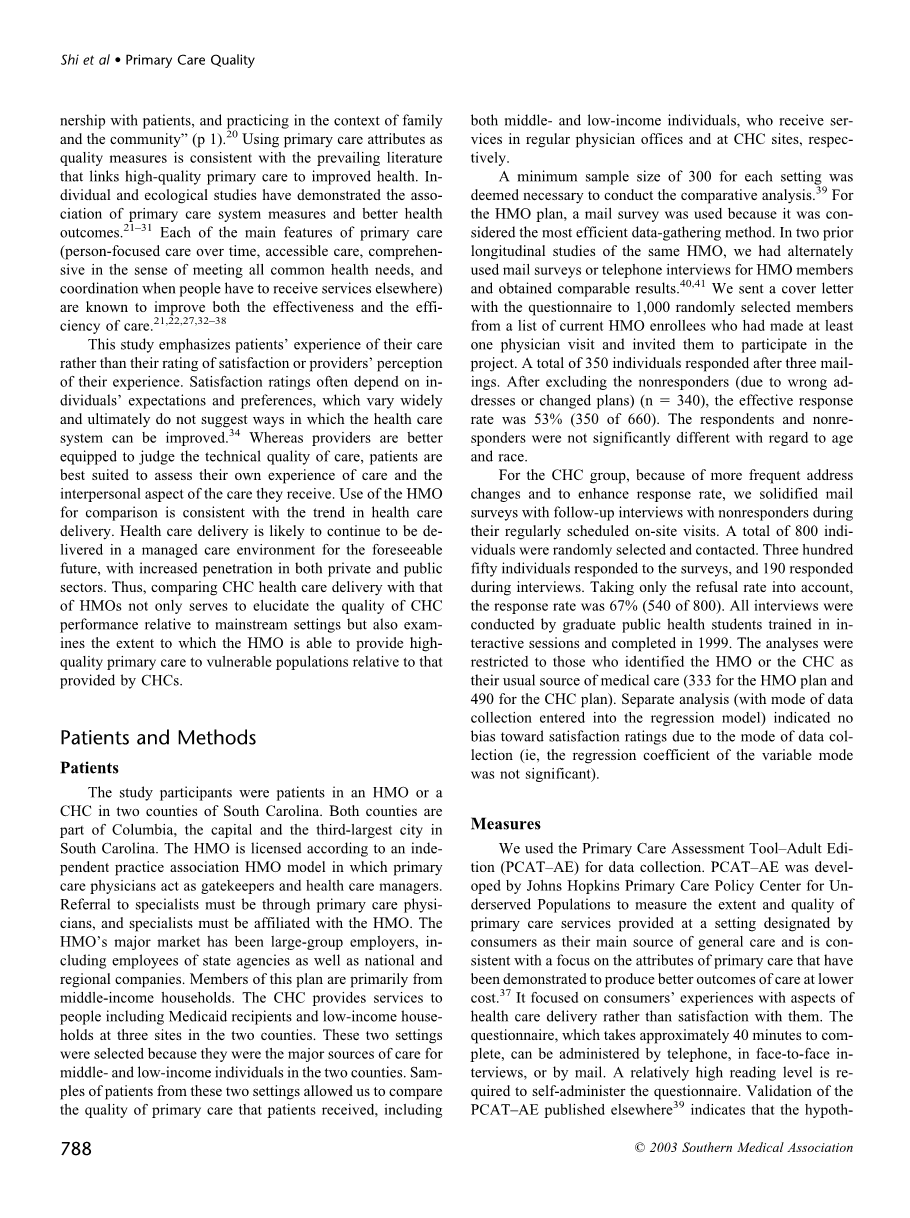 研究参与者是南卡罗来纳州两个县的健康维护组织或社区卫生中心的患者。这两个县都是南卡罗来纳州首府和第三大城市哥伦比亚的一部分。健康维护组织是根据独立的实践协会健康维护组织模式获得许可的,在该模式中,初级保健医生充当守门人和保健经理。转诊到专家必须通过初级保健医生,专家必须附属于健康维护组织。健康维护组织的主要市场一直是大集团雇主,包括国家机构以及国家和地区公司的雇员。该计划的成员主要来自中等收入家庭。该中心在两个县的三个地点向包括医疗补助领取者和低收入家庭在内的人们提供服务。选择这两种环境是因为它们是这两个县中低收入个人护理的主要来源。来自这两个环境的患者样本使我们能够比较患者接受的初级保健的质量,包括分别在正规诊所和CHC站点接受服务的中低收入人群。