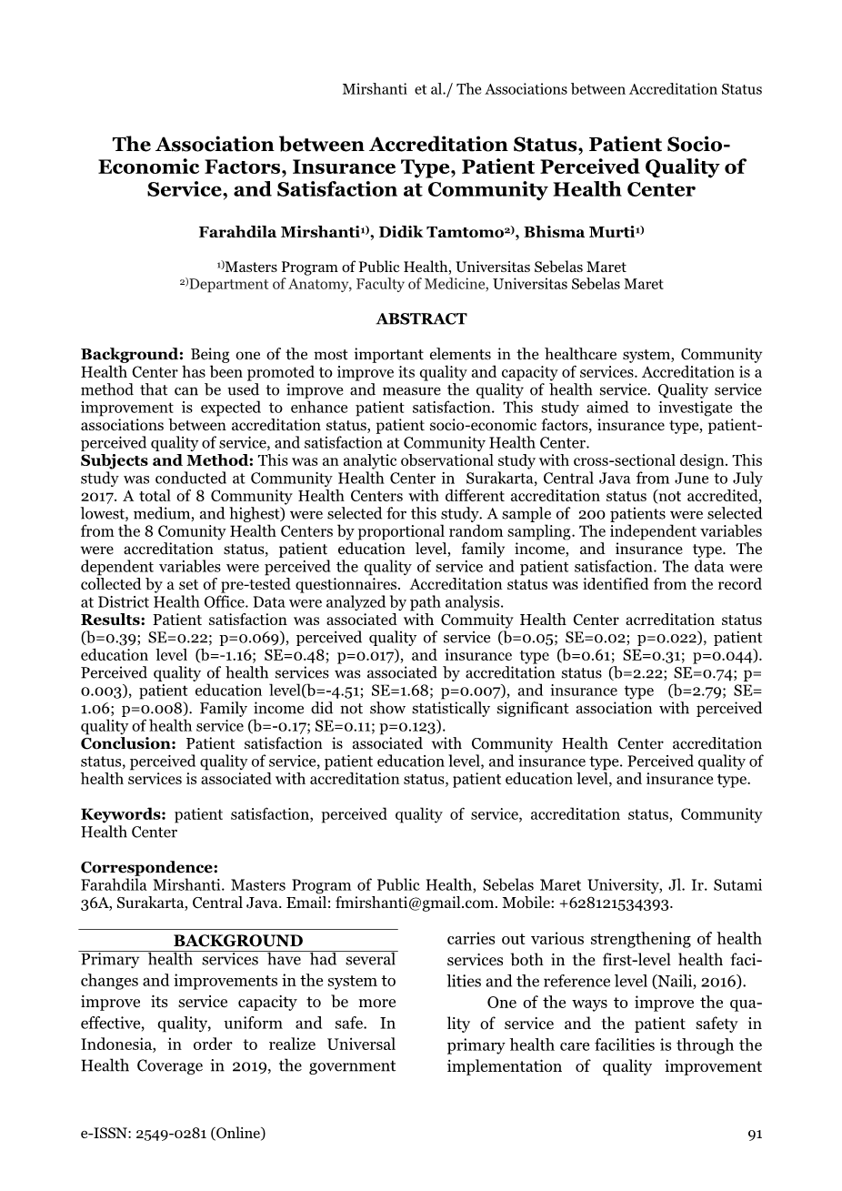 主题和方法:这是一项横断面设计的分析观察性研究。这项研究于2017年6月至2017年7月在中爪哇省苏拉卡塔市的社区卫生中心进行。研究一共选择了8个具有不同认证状态(未认证,最低,中度和最高)的社区卫生中心。通过比例随机抽样(proportional random sampling)从8个社区卫生中心中选出200名患者。自变量为认可状况、病患的受教育程度、家庭收入及保险类型。因变量为服务品质与病人满意度。数据通过一组经过预调查的问卷收集。认证状态是根据地区卫生局的记录确定的。资料采用路径分析。