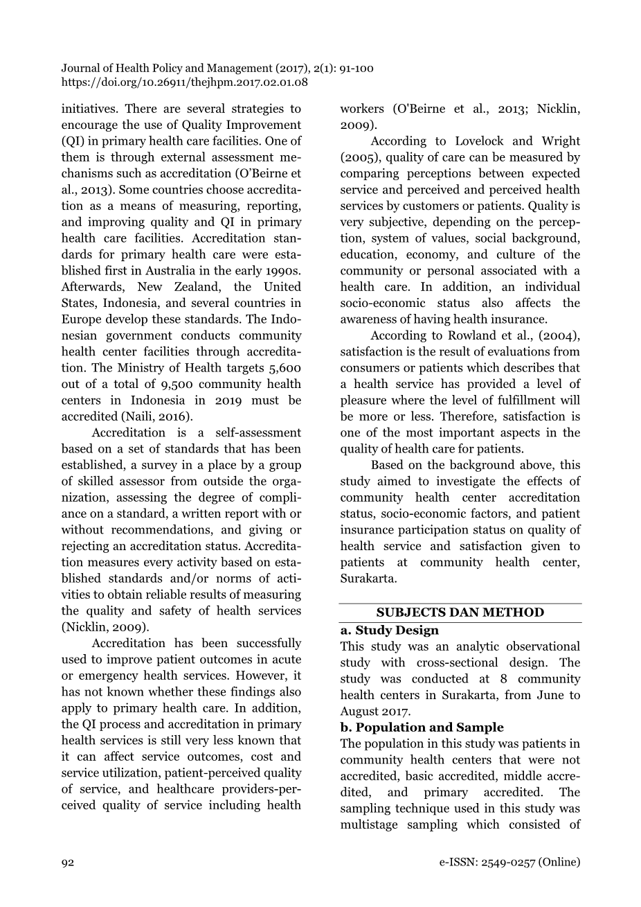 基于以上背景,本研究旨在探讨社区卫生中心认可状况、社会经济因素及病患保险参与状况对苏拉卡塔市社区卫生中心医疗服务质量及患者满意度的影响。
