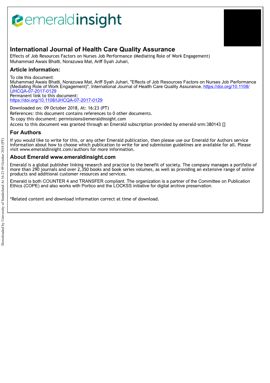 作业安全在此定义为在受威胁的作业情况下保持所需的连续性和稳定性的能力。护理被认为是世界上最安全的工作之一,尽管事实上护士可能会出于某种原因而离开工作地点,但找到另一份工作通常并不成问题(Wuetal。,2007)。就工作而言,不同的护士具有不同的安全级别;与其他护士以及普通雇员相比,获得许可的实际护士具有较高的工作保障水平。相比之下,与医院,特别是政府医院的同事相比,在非医院环境工作的护士的工作保障相对较少(Sperlich等,2009;Bhatti等,2018)。因此,员工的适当工作保障对于提高员工的生产率及其对工作投入的影响至关重要。