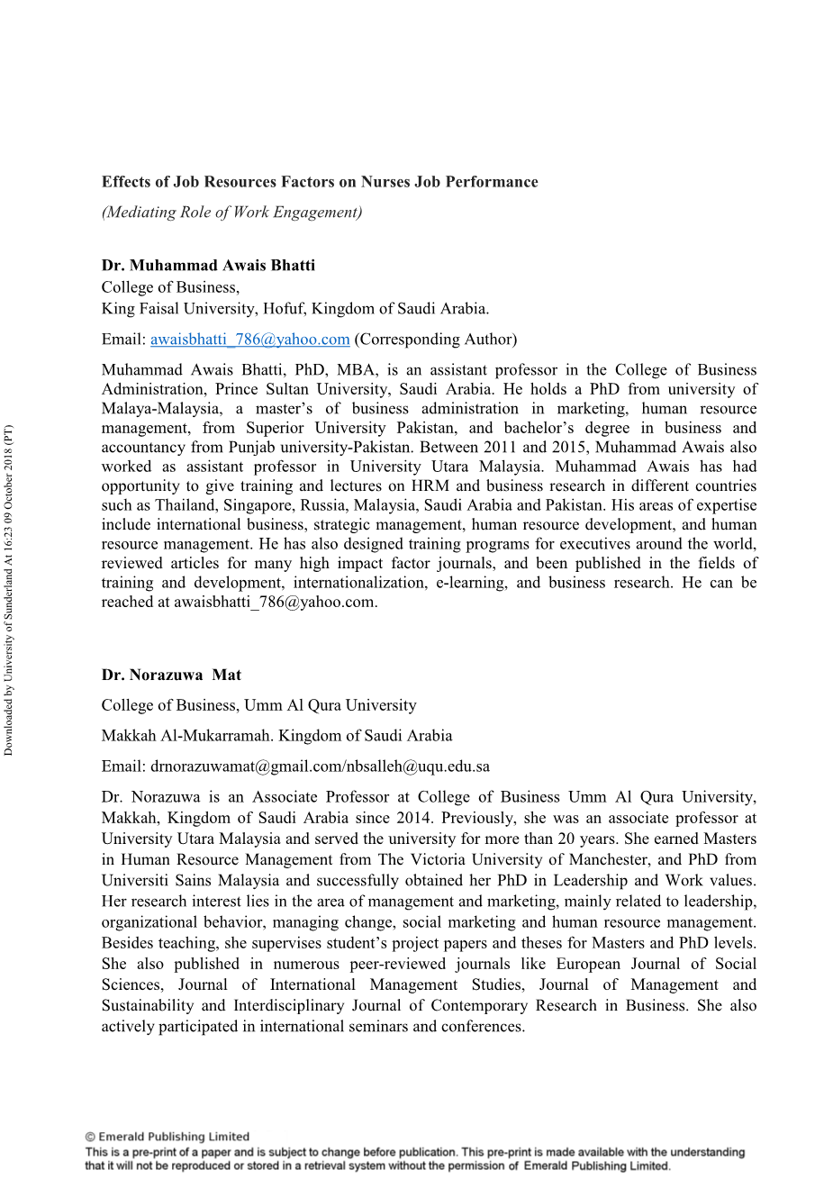 Catherine等人(2017)研究了工作参与的成果,并报告说工作参与的主要成果之一是更高水平的绩效,并建议研究人员应探索工作参与在不同环境中的作用。此外,安托瓦内特(Antoinette,2012年)试图将工作投入概念化,并建议护士的工作投入可以提高护士的个人主动性,使他们具有感染力,降低医院死亡率,并显着提高组织的财务盈利能力。因此,可以说这些研究突出了工作投入的作用,这些工作是各种工作资源与工作成果之间关系背后的引擎。但是,在较少程度上研究的一种关系是工作参与在工作资源与工作绩效之间的关系中起中介作用。需要就工作绩效,特别是在护士职业方面,进一步讨论和探讨工作投入。这项研究将着重于工作投入作为个人资源和工作绩效之间的中介。