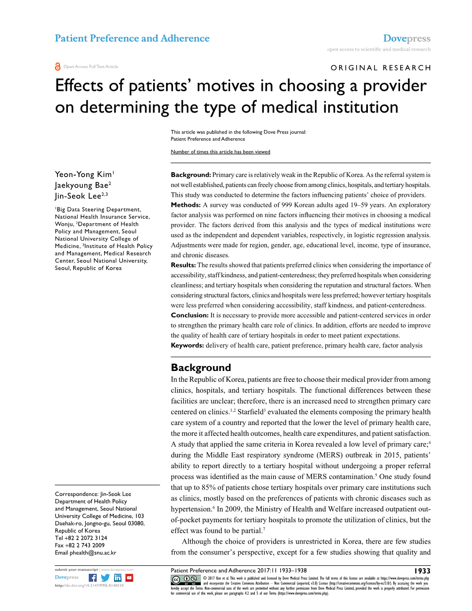 关键字: 提供医疗保健,患者偏爱,初级医疗保健,因素分析