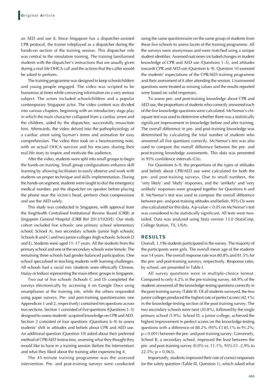 我们创建了一个名为DARE的培训计划,或者叫做调度员协助的第一回应者。DARE是一个45分钟的项目,包括13分钟的视频和在假人上动手进行CPR和AED练习。该课程的核心教学要点是:(A)立即拨打lsquo;995rsquo;救护车,并保持通话在线;(B)通过用力快速地按压胸部中心来实施胸外按压;(C)指示某人拿取AED并使用它。由于新加坡的调度员协助CPR的协议,因此培训师在培训课程的动手部分中扮演调度员的角色。调度员的角色是模拟训练的核心。培训使学生熟悉调度员在实际的OHCA呼调用中会给出的指示以及要求呼叫员执行的操作。培训方案的目的是让学童和青年参与。这段视频有时是幽默的,同时传达了一个有关非常严肃的主题的信息。演员包括学生和一位受欢迎的当代新加坡演员。视频内容分为不同的章节,首先从一个介绍性的舞台剧开始,在该剧中,主角心脏骤停,孩子们在调度员的帮助下成功地救活了他。然后,为便于理解,视频使用外行的术语和动画深入探索了心脏骤停的病理生理过程。视频随后呈现了感人的基调,一位真正的OHCA幸存者和他的救援人员分享了他们的真实故事以鼓舞和激发观众。