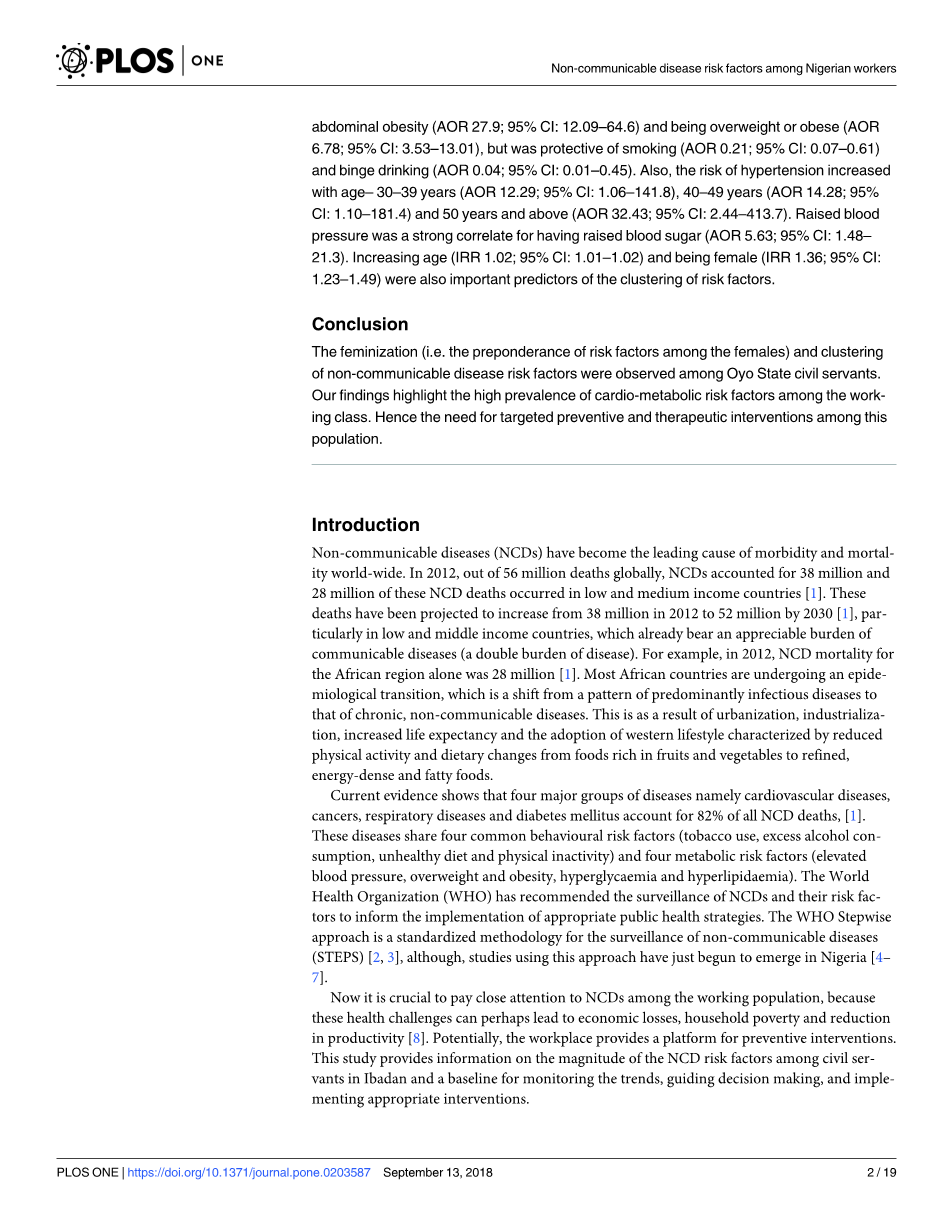 目前的证据显示,心血管疾病、癌症、呼吸系统疾病和糖尿病四大类疾病占所有非传染性疾病死亡的82%。这些疾病共有四种常见的行为风险因素(烟草使用、过量饮酒、不健康饮食和缺乏运动)和四种代谢风险因素(高血压、超重和肥胖、高血糖和高血脂)。世界卫生组织(世卫组织)建议监测非传染性疾病及其危险因素,以便为实施适当的公共卫生战略提供信息。世卫组织逐步方法是监测非传染性疾病的一种标准化方法,尽管使用这种方法的研究刚刚开始在尼日利亚出现。