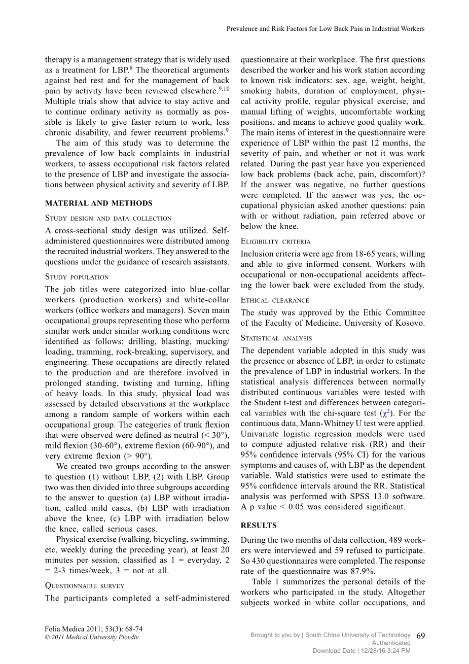 目标:本研究的目的是确定工业工人腰痛(LBP)的患病率,分析可能与腰痛相关的危险因素,并探讨身体活动和腰痛的严重程度之间的关联。