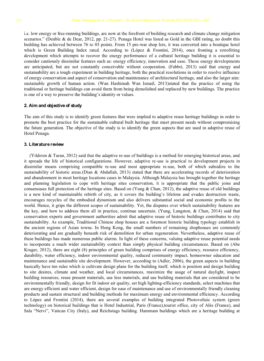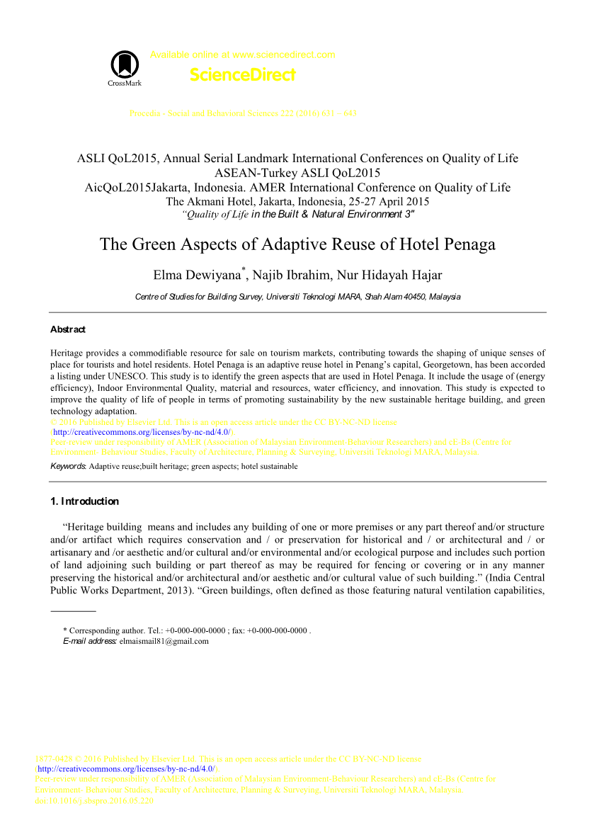 遗产为旅游市场提供了可销售的资源,致力于为游客和酒店居民塑造独特的场所感。柏那卡精品酒店是槟城首府——乔治城的适应性再利用酒店,已依照联合国教科文组织上市。本研究旨在确定柏那卡精品酒店绿化方面的情况。它(能源效率)包括,室内环境质量,物质资源,水利用效率和新观念。这项研究期望能通过新的可持续遗产建筑和绿色技术的适应性来提高人们的生活质量,并同时促进可持续发展。这出自于2015年由Elsevier Ltd出版,AMER(马来西亚环境行为研究人员协会)和CEBS(马来西亚大学技术大学技术学院建筑规划与测量学院环境行为研究中心)的选择和同行评议。