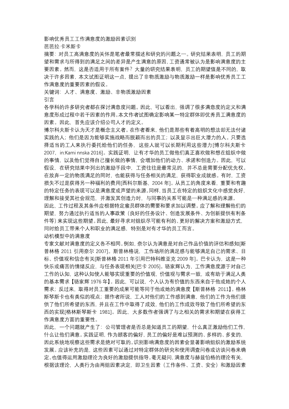 - 影响优秀员工工作满意度的激励因素识别外文翻译资料