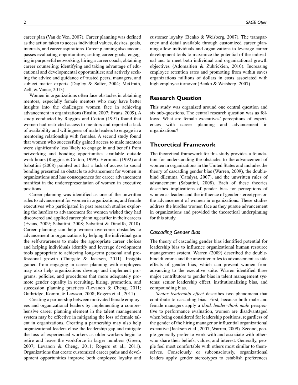 本研究的理论框架为理解美国妇女在组织中进步的障碍提供了基础,包括级联性别偏见理论(Warren,2009),双重束缚困境(Catalyst,,2007)和不成文的晋升规则(Sabattini,2008)。每一种理论都描述了性别偏见对妇女作为领导人的看法的影响,以及性别陈规定型观念对提高组织中妇女地位的影响。这些研究解决了妇女在追求组织进步时面临的障碍,为本研究提供了理论基础。