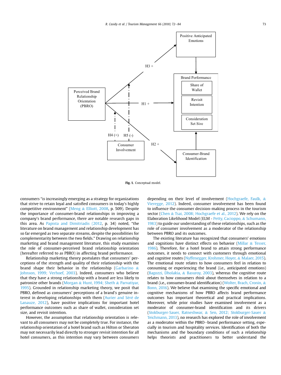 现有文献已经认识到,消费者的情感和认知对行为有明显的影响。因此,要使酒店品牌获得出色的绩效结果,就需要通过情感和认知途径与客户建立联系。情感途径与消费者对消费或体验品牌的感受(即预期的情感)有关,而认知途径与消费者对品牌的看法有关(即消费者品牌识别)。我们认为,研究PBRO如何影响品牌绩效结果的特定情感和认知机制具有重要的理论和实践意义。此外,虽然先前的研究已经审查了作为消费者品牌识别及其驱动力的调节者的参与,尚无研究探讨参与作为PBRO品牌绩效设置中的主持人的作用,尤其是在旅游和酒店服务中。识别这种关系的机制和边界条件,有助于理论家和从业人员更好地了解在不同程度的消费者参与下,消费者认知和情感途径对与品牌相关的结果的有效性。