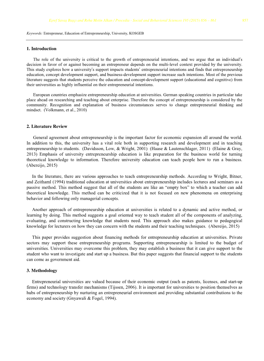 关于创业的普遍协议是全世界经济扩张的重要因素。除此之外,该大学在支持研究和发展以及向学生教授创业方面发挥着至关重要的作用。(Davidsson,Low,&Wright,2001)(Haase&Lautenschlager,2011)(Elaine&Gray,2013)大学创业教育的重点就像为商业世界做准备,将理论知识转化为信息。因此,大学教育可以教人们如何经营企业。(abereijo,2015年)