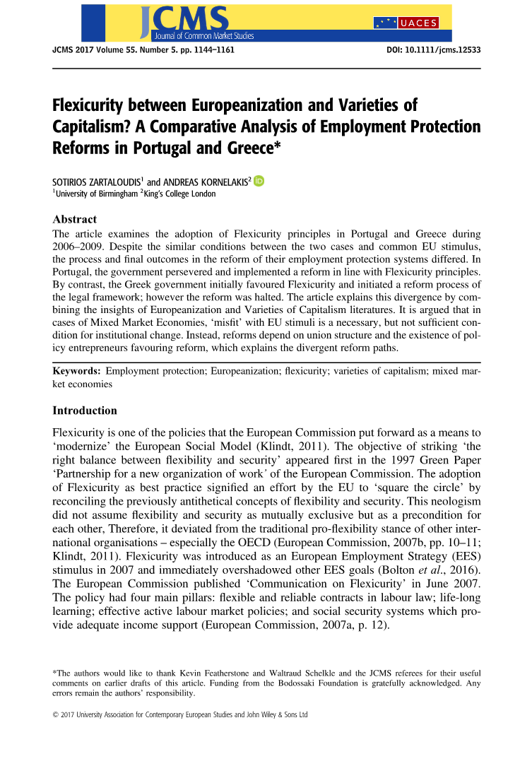 本文考察了2006-2009年葡萄牙和希腊采用弹性安全原则的情况。尽管这两个案例和欧盟共同刺激措施的条件相似,但它们的就业保护制度改革的进程和最终结果却不同。在葡萄牙,政府坚持并实施了符合弹性安全原则的改革。相比之下,希腊政府最初支持弹性安全,并启动了法律框架的改革进程;然而,改革停止了。本文结合欧洲化的观点和资本主义文学的多样性来解释这种分歧。有人认为,在混合市场经济的情况下,与欧盟刺激“不匹配”是制度变革的必要条件,但还不够。相反,改革取决于工会结构和支持改革的政治企业家的存在,这解释了不同的改革路径。