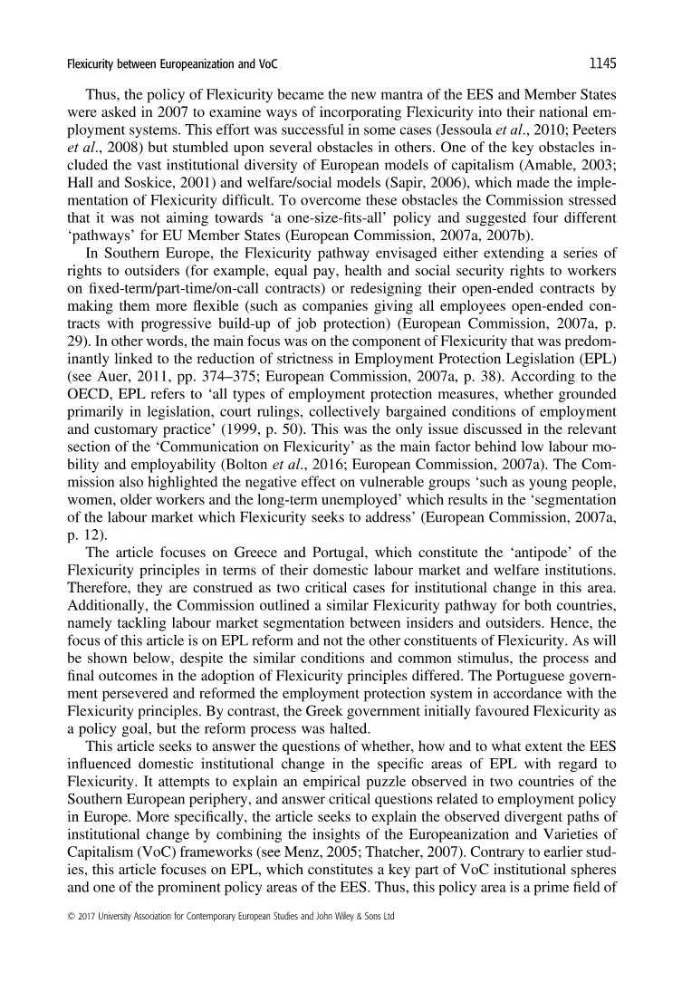 本文旨在回答EES是否、如何以及在多大程度上影响了EPL特定地区与弹性安全有关的国内体制变革的问题。它试图解释在南欧外围两个国家观察到的一个经验难题,并回答与欧洲就业政策有关的关键问题。更具体地说,本文试图通过结合欧洲化和资本主义多样化框架的见解来解释观察到的制度变迁的不同路径(见Menz,2005;撒切尔,2007)。与之前的研究相反,本文的重点是EPL,它是挥发性有机化合物制度领域的一个关键部分,也是EES的一个突出政策领域。因此,这一政策领域是一个素域