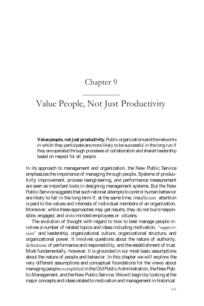 新公共服务在探讨管理和组织时强调的是通过人进行管理的重要性。 由生产力改进、过程管理和绩效测量构成的系统被视为设计管理系统的重要工具。 但是, 新公共服务表明,如果我们不同时给予一个组织中个体成员的价值和利益以足够的关注,那么,从长远的观点来看,这种试图控制人类行为的理性做法很可能会失败。此外,尽管这些方法可以取得成果,但是它们却不能造就负责任的、 投人的并且有公民意识的雇员或公民。