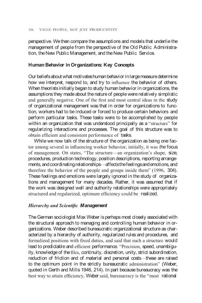 与管理和控制组织中人员行为的结构方法关系最为密切也许要数德国社会学家马克斯·韦伯 (Max Weber). 韦伯把官僚制组织结构的特征描述成为一个由权威、系统化的规则和程序以及具有确定职责的正式职位构成的层级体制,他认为这样一种结构可以导致可预见的并且有效率的绩效。“精确、迅速、明确、对文件的了解、连续性、自由裁量权、统一性、严格服从、减少摩擦以及节约材料和个人成本-这些在严格的官僚制行政中都被提高到了最优点”(Weber,引自 Gerth and Mills1946,214).在某种程度上,由于官僚制是实现效率的最佳途径,所以韦伯说官僚制是“对人实施必要控制的最理性已知手段”(337)。这一点在某种程度上是通过 157使行政过程尽可能地客观、理性和非人格化来实现的。“客观地履行职责主要是指#39;不计及人的因素#39;并且按照可计算的规则履行职责”(215)。韦伯接着指出, 这种对工作的非人格化“就是官僚制的特有本性而且它被誉为官僚制的特殊优点”(216).